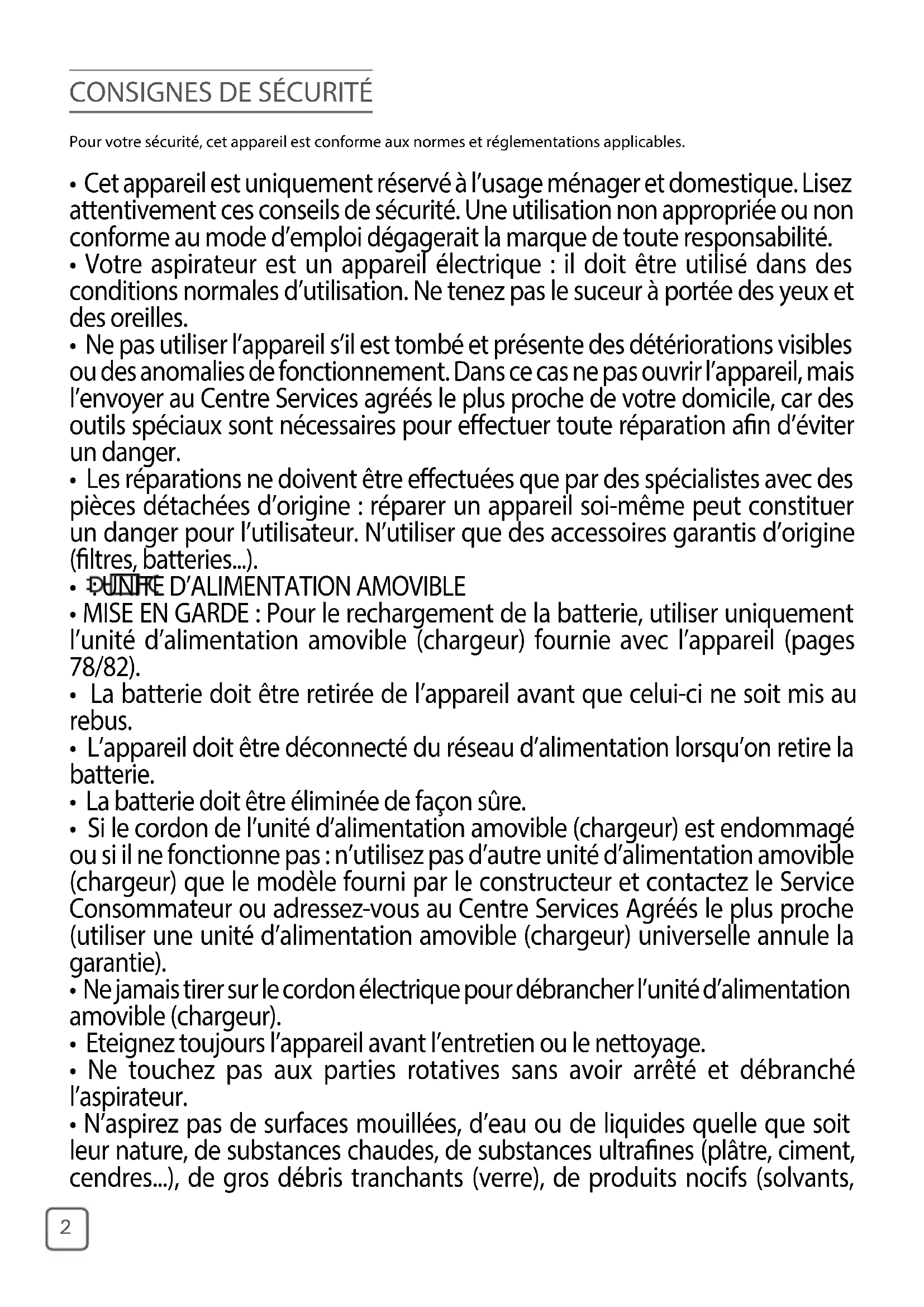 - N’aspirez pas de surfaces mouillées, d’eau ou de liquides quelle que soit leur nature, de substances chaudes, de substances ultranes (plâtre, ciment, cendres...), de gros débris tranchants (verre), de produits nocifs (solvants,33 décapants...), agressifs (acides, nettoyants...), inammables et explosifs (à base d’essence ou d’alcool).