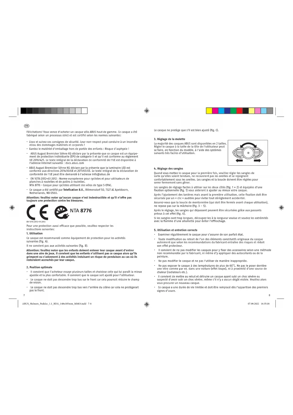 - Ne stockez et n’utilisez pas le produit dans des endroits où la température peut être inférieure à 0°C ou supérieure à +60°C. N’exposez pas le produit au rayonnement direct du soleil pour une période prolongée ! Mise au rebut Ce produit contient des matières premières précieuses. À la n de sa durée de vie, éliminez le produit conformément aux exigences légales applicables. Les appareils électriques, les piles rechargeables et les batteries ne doivent pas être éliminés avec les déchets ménagers. L‘élimination doit être eectuée conformément à la directive 2012/19/UE relative aux déchets d‘équipements électriques et électroniques (DEEE), ou à la directive 2006/66/CE relative aux piles et accumulateurs et aux déchets de piles et d‘accumu- lateurs. Pour toute question, veuillez contacter l‘autorité locale responsable de la mise au rebut. Vous pouvez obtenir des informations sur les points de collecte de vos anciens appareils, par exemple auprès de l‘administration communale ou municipale, des entreprises locales de collecte des déchets ou de votre revendeur spécialisé. Éliminez les emballages séparément selon leur nature. Éliminez le carton-pâte et le carton avec le papier recyclé, les lms et les pièces en plastique avec les matières recyclables. WEEE-Reg.-Nr. DE79663011 ABUS_Helmets_Pedelec_1.1_BDA_148x105mm_MMO.indd 9-10ABUS_Helmets_Pedelec_1.1_BDA_148x105mm_MMO.indd 9-10 07.09.2022 16:35:1807.09.2022 16:35:1811 12