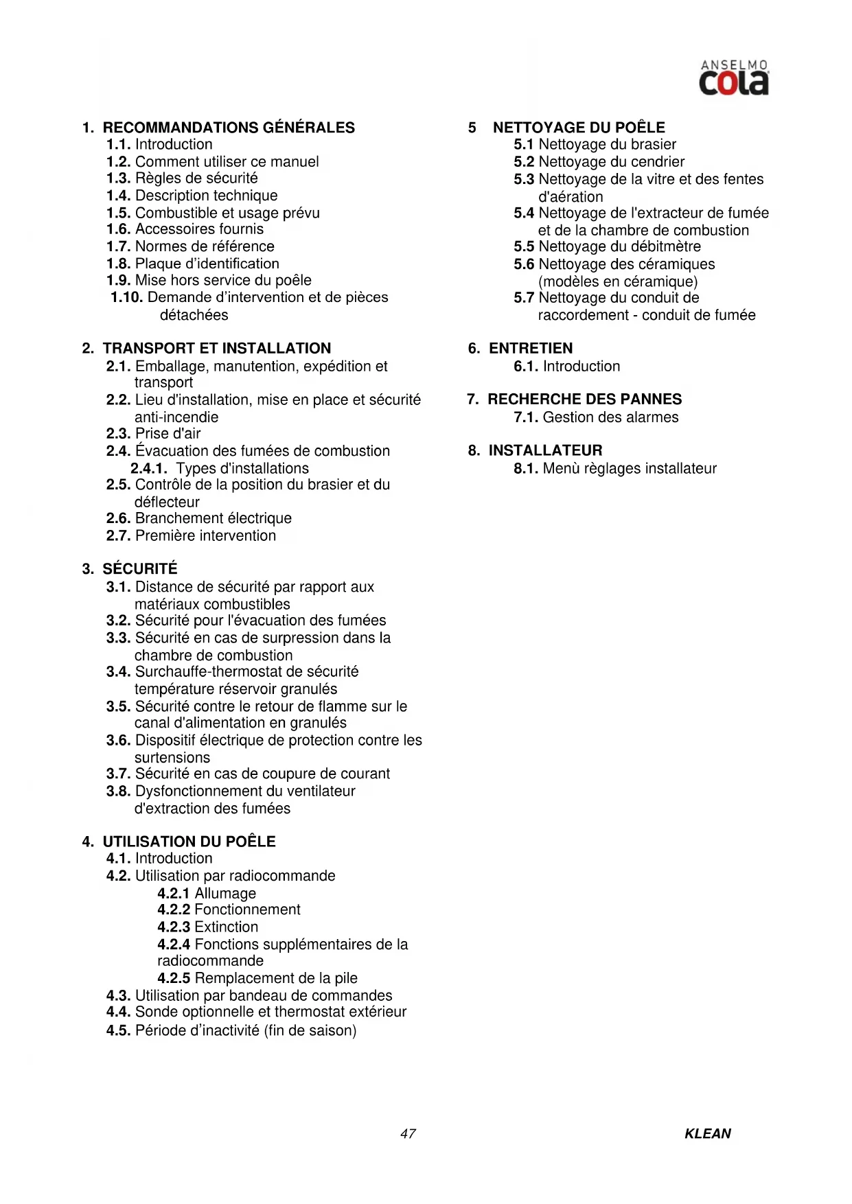 Pour toutes les opérations d'entretien ou de nettoyage de fin de saison, la société COLA recommande de faire appel à un centre d'assistance agréé qui vérifiera par la même occasion l'état d'usure des composants internes du poêle.