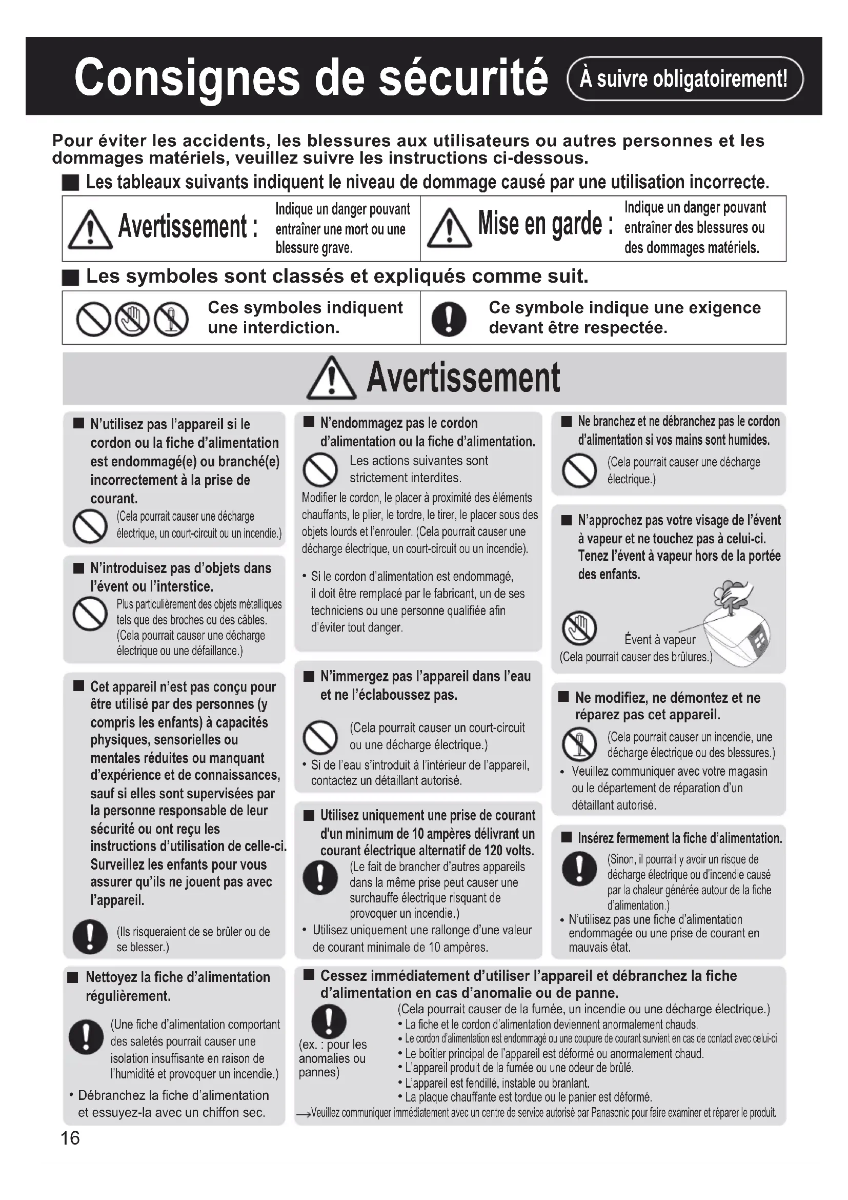 Mise en garde : Indique un danger pouvantentraîner des blessures oudes dommages matériels.Ces symboles indiquentune interdiction.Ce symbole indique une exigencedevant être respectée.Pour éviter les accidents, les blessures aux utilisateurs ou autres personnes et lesdommages matériels, veuillez suivre les instructions ci-dessous.N’utilisez pas l’appareil si lecordon ou la fiche d’alimentationest endommagé(e) ou branché(e)incorrectement à la prise decourant.N’endommagez pas le cordond’alimentation ou la fiche d’alimentation.Ne branchez et ne débranchez pas le cordond’alimentation si vos mains sont humides.N’approchez pas votre visage de l’éventà vapeur et ne touchez pas à celui-ci. Tenez l’évent à vapeur hors de la portéedes enfants.Ne modifiez, ne démontez et neréparez pas cet appareil.Insérez fermement la fiche d’alimentation.N’immergez pas l’appareil dans l’eauet ne l’éclaboussez pas.Utilisez uniquement une prise de courantd'un minimum de 10 ampères délivrant un courant électrique alternatif de 120 volts.(Cela pourrait causer une déchargeélectrique, un court-circuit ou un incendie.)Plus particulièrement des objets métalliquestels que des broches ou des câbles.(Cela pourrait causer une déchargeélectrique ou une défaillance.) (Ils risqueraient de se brûler ou de se blesser.) N’introduisez pas d’objets dansl’évent ou l’interstice.Cet appareil n’est pas conçu pourêtre utilisé par des personnes (ycompris les enfants) à capacitésphysiques, sensorielles oumentales réduites ou manquantd’expérience et de connaissances, sauf si elles sont supervisées parla personne responsable de leursécurité ou ont reçu lesinstructions d’utilisation de celle-ci.Surveillez les enfants pour vousassurer qu’ils ne jouent pas avecl’appareil.Les actions suivantes sontstrictement interdites.(Cela pourrait causer une déchargeélectrique.)(Cela pourrait causer un incendie, unedécharge électrique ou des blessures.)(Sinon, il pourrait y avoir un risque dedécharge électrique ou d’incendie causépar la chaleur générée autour de la fiched’alimentation.)(Cela pourrait causer un court-circuitou une décharge électrique.)(Le fait de brancher d’autres appareilsdans la même prise peut causer unesurchauffe électrique risquant deprovoquer un incendie.)Modifier le cordon, le placer à proximité des élémentschauffants, le plier, le tordre, le tirer, le placer sous desobjets lourds et l’enrouler. (Cela pourrait causer unedécharge électrique, un court-circuit ou un incendie).