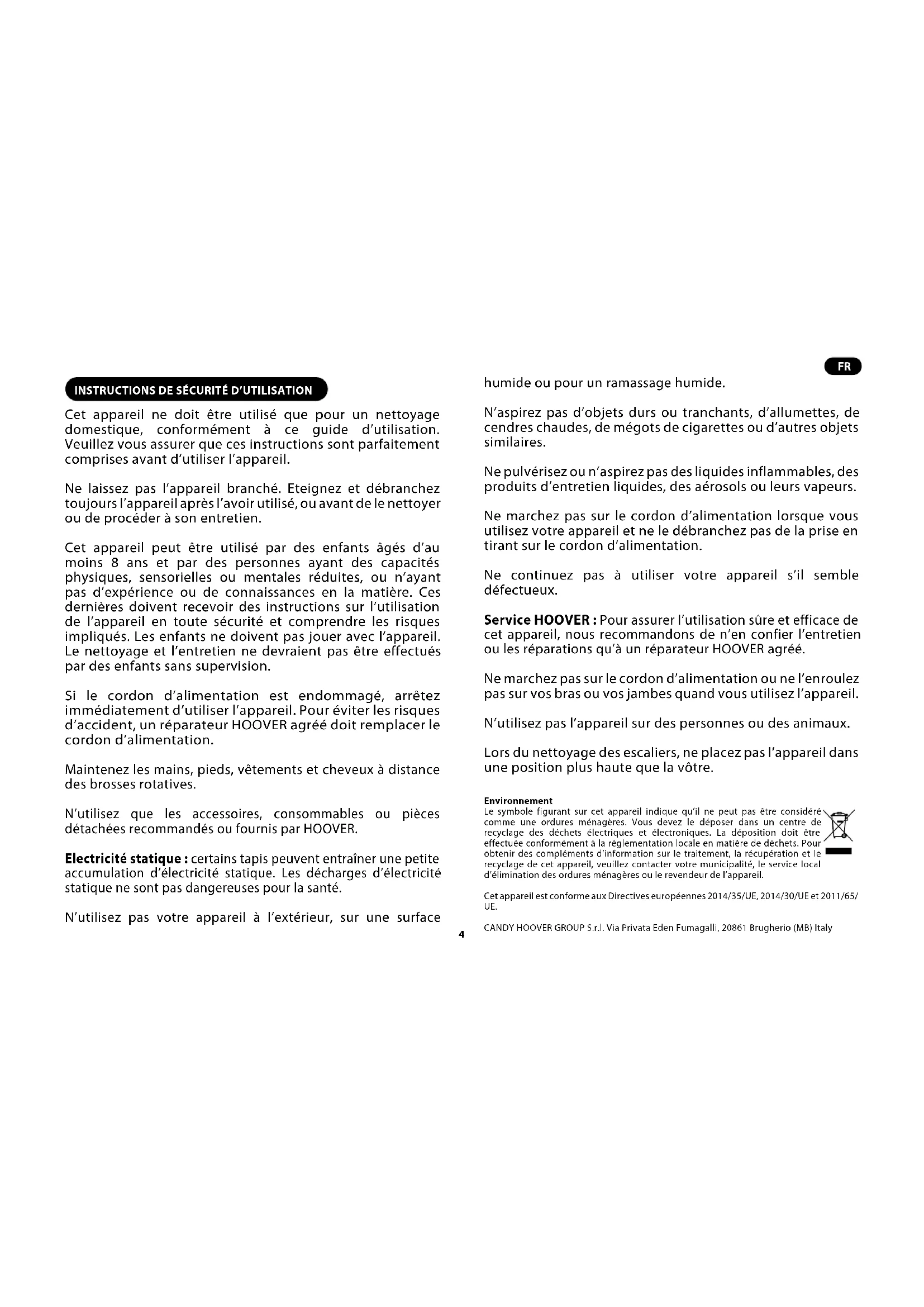 Cet appareil ne doit être utilisé que pour un nettoyage domestique, conformément à ce guide d’utilisation. Veuillez vous assurer que ces instructions sont parfaitement comprises avant d’utiliser l’appareil. Ne laissez pas l’appareil branché. Eteignez et débranchez toujours l’appareil après l’avoir utilisé, ou avant de le nettoyer ou de procéder à son entretien. Cet appareil peut être utilisé par des enfants âgés d’au moins 8 ans et par des personnes ayant des capacités physiques, sensorielles ou mentales réduites, ou n’ayant pas d’expérience ou de connaissances en la matière. Ces dernières doivent recevoir des instructions sur l’utilisation de l’appareil en toute sécurité et comprendre les risques impliqués. Les enfants ne doivent pas jouer avec l’appareil. Le nettoyage et l’entretien ne devraient pas être effectués par des enfants sans supervision. Si le cordon d’alimentation est endommagé, arrêtez immédiatement d’utiliser l’appareil. Pour éviter les risques d’accident, un réparateur HOOVER agréé doit remplacer le cordon d’alimentation. Maintenez les mains, pieds, vêtements et cheveux à distance des brosses rotatives. N’utilisez que les accessoires, consommables ou pièces détachées recommandés ou fournis par HOOVER. Electricité statique : certains tapis peuvent entraîner une petite accumulation d’électricité statique. Les décharges d’électricité statique ne sont pas dangereuses pour la santé. N’utilisez pas votre appareil à l’extérieur, sur une surface humide ou pour un ramassage humide. N’aspirez pas d’objets durs ou tranchants, d’allumettes, de cendres chaudes, de mégots de cigarettes ou d’autres objets similaires. Ne pulvérisez ou n’aspirez pas des liquides inflammables, des produits d’entretien liquides, des aérosols ou leurs vapeurs. Ne marchez pas sur le cordon d’alimentation lorsque vous utilisez votre appareil et ne le débranchez pas de la prise en tirant sur le cordon d’alimentation. Ne continuez pas à utiliser votre appareil s’il semble défectueux. Service HOOVER : Pour assurer l’utilisation sûre et efficace de cet appareil, nous recommandons de n’en confier l’entretien ou les réparations qu’à un réparateur HOOVER agréé. Ne marchez pas sur le cordon d’alimentation ou ne l’enroulez pas sur vos bras ou vos jambes quand vous utilisez l’appareil. N’utilisez pas l’appareil sur des personnes ou des animaux. Lors du nettoyage des escaliers, ne placez pas l’appareil dans une position plus haute que la vôtre. Environnement Le symbole figurant sur cet appareil indique qu’il ne peut pas être considéré comme une ordures ménagères. Vous devez le déposer dans un centre de recyclage des déchets électriques et électroniques. La déposition doit être effectuée conformément à la réglementation locale en matière de déchets. Pour obtenir des compléments d’information sur le traitement, la récupération et le recyclage de cet appareil, veuillez contacter votre municipalité, le service local d’élimination des ordures ménagères ou le revendeur de l’appareil. Cet appareil est conforme aux Directives européennes 2014/35/UE, 2014/30/UE et 2011/65/ UE. CANDY HOOVER GROUP S.r.l. Via Privata Eden Fumagalli, 20861 Brugherio (MB) Italy
