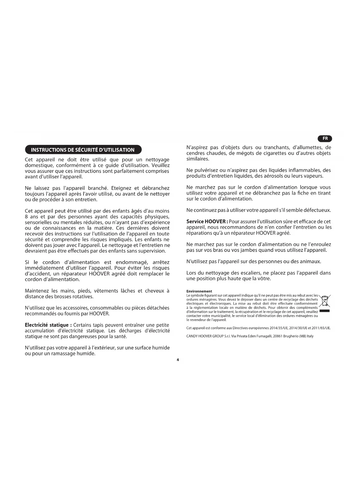 Cet appareil ne doit être utilisé que pour un nettoyage domestique, conformément à ce guide d’utilisation. Veuillez vous assurer que ces instructions sont parfaitement comprises avant d’utiliser l’appareil. Ne laissez pas l’appareil branché. Eteignez et débranchez toujours l’appareil après l’avoir utilisé, ou avant de le nettoyer ou de procéder à son entretien. Cet appareil peut être utilisé par des enfants âgés d’au moins 8 ans et par des personnes ayant des capacités physiques, sensorielles ou mentales réduites, ou n’ayant pas d’expérience ou de connaissances en la matière. Ces dernières doivent recevoir des instructions sur l’utilisation de l’appareil en toute sécurité et comprendre les risques impliqués. Les enfants ne doivent pas jouer avec l’appareil. Le nettoyage et l’entretien ne devraient pas être eectués par des enfants sans supervision. Si le cordon d’alimentation est endommagé, arrêtez immédiatement d’utiliser l’appareil. Pour éviter les risques d’accident, un réparateur HOOVER agréé doit remplacer le cordon d’alimentation. Maintenez les mains, pieds, vêtements lâches et cheveux à distance des brosses rotatives. N’utilisez que les accessoires, consommables ou pièces détachées recommandés ou fournis par HOOVER. Electricité statique : Certains tapis peuvent entraîner une petite accumulation d’électricité statique. Les décharges d’électricité statique ne sont pas dangereuses pour la santé. N’utilisez pas votre appareil à l’extérieur, sur une surface humide ou pour un ramassage humide. N’aspirez pas d’objets durs ou tranchants, d’allumettes, de cendres chaudes, de mégots de cigarettes ou d’autres objets similaires. Ne pulvérisez ou n’aspirez pas des liquides inammables, des produits d’entretien liquides, des aérosols ou leurs vapeurs. Ne marchez pas sur le cordon d’alimentation lorsque vous utilisez votre appareil et ne débranchez pas la che en tirant sur le cordon d’alimentation. Ne continuez pas à utiliser votre appareil s’il semble défectueux. Service HOOVER : Pour assurer l’utilisation sûre et ecace de cet appareil, nous recommandons de n’en coner l’entretien ou les réparations qu’à un réparateur HOOVER agréé. Ne marchez pas sur le cordon d’alimentation ou ne l’enroulez pas sur vos bras ou vos jambes quand vous utilisez l’appareil. N’utilisez pas l’appareil sur des personnes ou des animaux. Lors du nettoyage des escaliers, ne placez pas l’appareil dans une position plus haute que la vôtre. Environnement Le symbole gurant sur cet appareil indique qu’il ne peut pas être mis au rebut avec les ordures ménagères. Vous devez le déposer dans un centre de recyclage des déchets électriques et électroniques. La mise au rebut doit être eectuée conformément à la réglementation locale en matière de déchets. Pour obtenir des compléments d’information sur le traitement, la récupération et le recyclage de cet appareil, veuillez contacter votre municipalité, le service local d’élimination des ordures ménagères ou le revendeur de l’appareil. Cet appareil est conforme aux Directives européennes 2014/35/UE, 2014/30/UE et 2011/65/UE. CANDY HOOVER GROUP S.r.l. Via Privata Eden Fumagalli, 20861 Brugherio (MB) Italy5