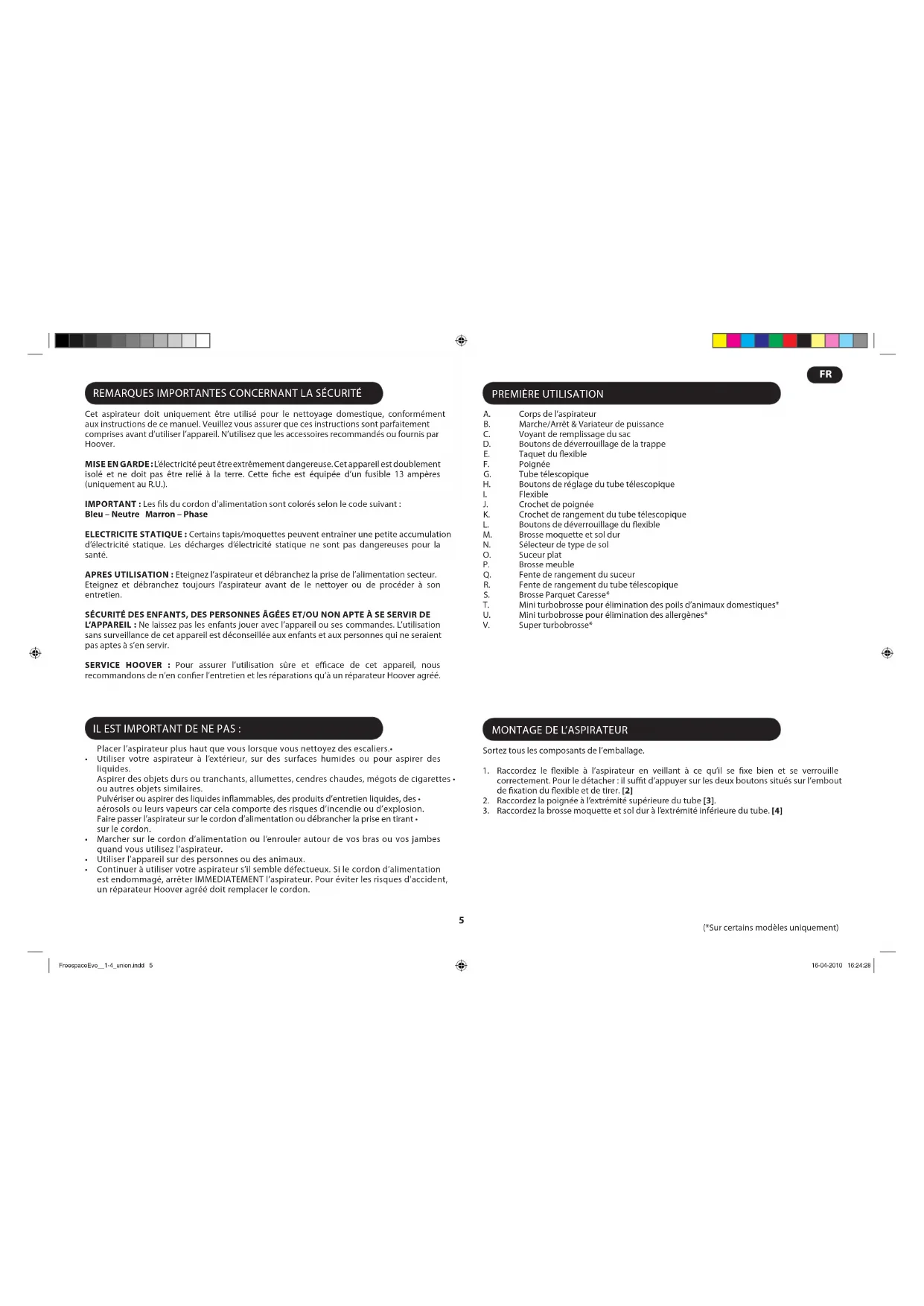 En cas de problèmes avec l’appareil, eectuez les vérications de la liste de vérications avant d’appeler le service après-vente Hoover. L’aspirateur est-il alimenté en électricité ? Veuillez vérifier la prise utilisée avec un autre • appareil électrique. Le sac à poussière est-il saturé ? Veuillez vous reporter à « Entretien de l’aspirateur ».• Le filtre est-il encrassé ? Veuillez vous reporter à « Entretien de l’aspirateur ».• Le tube ou le flexible est-il bouché ? Veuillez vous reporter à « Pour éliminer une • obstruction ». L’aspirateur a-t-il surchauffé ? Si c’est le cas, il lui faudra environ 45 minutes pour se • réinitialiser automatiquement. INFORMATIONS IMPORTANTES Pièces détachées et consommables Hoover Toujours remplacer les pièces par des pièces détachées de la marque Hoover. Celles-ci sont disponibles auprès de votre revendeur Hoover. Lors de la commande de pièces, veuillez toujours préciser le numéro de votre modèle. Consommables Sac en papier : H69 - 35601053• Sac en micro fibres : H71 - 35601069 (Si disponible)• Micro filtre d’évacuation : T102 - 35601056• Filtre Hepa de protection du moteur : S107 - 35601057• Pièces détachées Brosse moquette et sol dur - G72 - 4845090• Flexible en tissu : - D118 - 35601054• Flexible - D122 - 35601055• Brosse Parquet Caresse : G90PCB - 35600934• Mini turbobrosse pour élimination des allergènes : J32 - 35600817• Super turbobrosse : J31 - 35600816• Service Hoover Pour toute intervention à tout moment, veuillez contacter le service après-vente Hoover le plus proche. FreespaceEvo__1-4_union.indd 7 16-04-2010 16:24:298