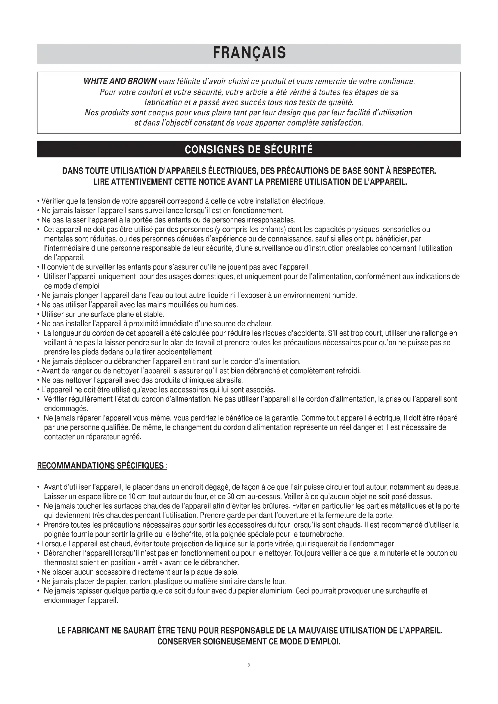 LE FABRICANT NE SAURAIT ETRE TENU POUR RESPONSABLE DE LA MAUVAISE UTILISATION DE L'APPAREIL. CONSERVER SOIGNEUSEMENT CE MODE D'EMPLOI.