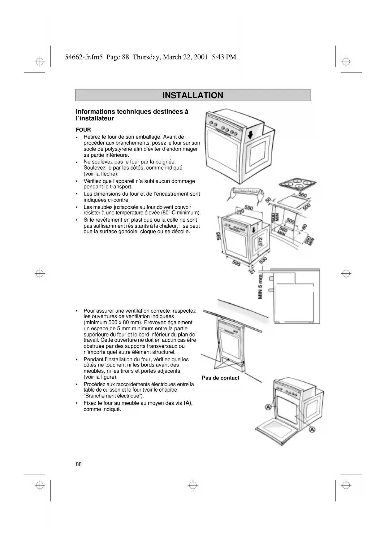 Fixez le four au meuble au moyen des vis (A), comme indiqué. INSTALLATION Pas de contact 54662-fr.fm5 Page 88 Thursday, March 22, 2001 5:43 PM89 Table de cuisson