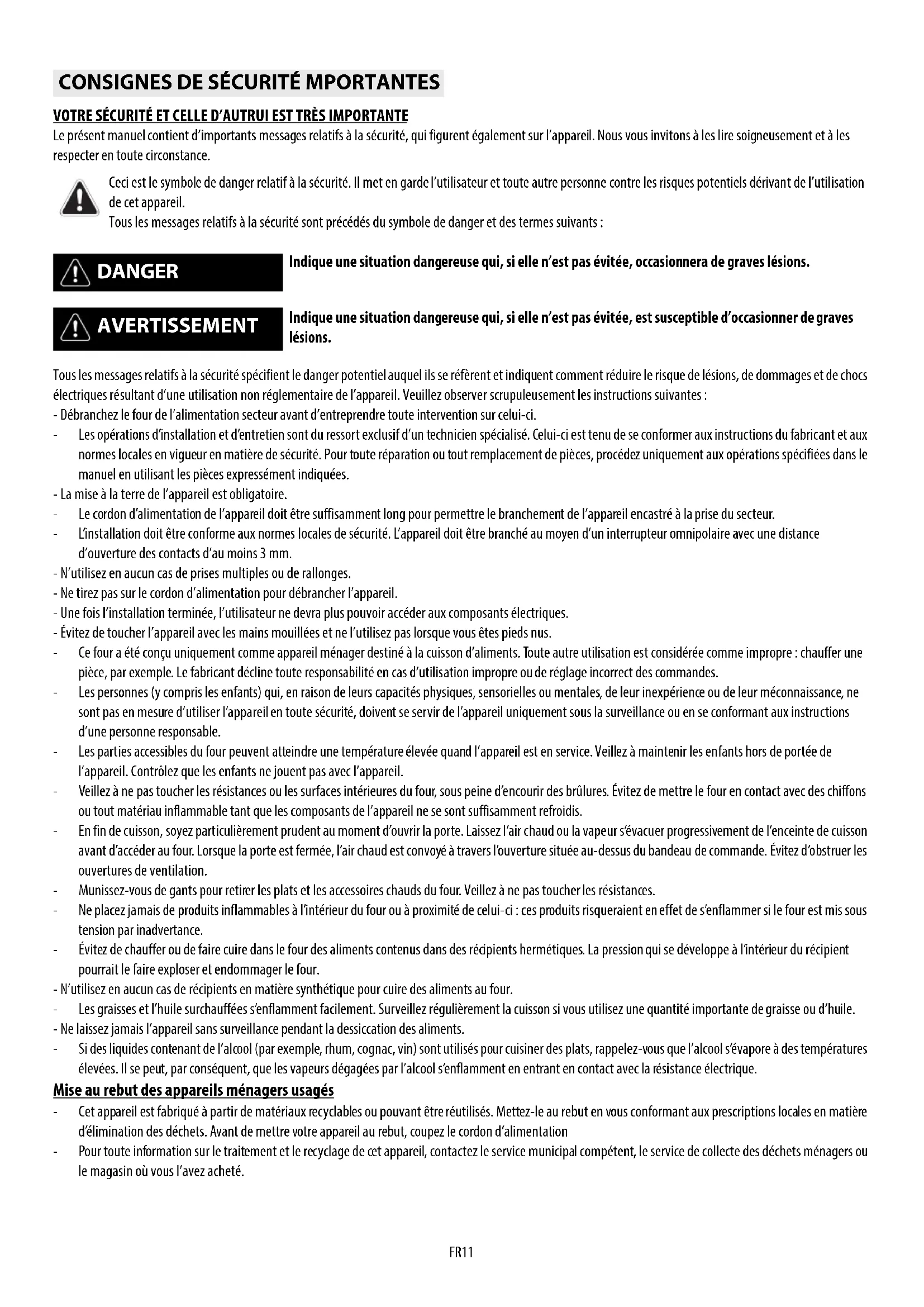 FR11 VOTRE SÉCURITÉ ET CELLE D’AUTRUI EST TRÈS IMPORTANTE Le présent manuel contient d’importants messages relatifs à la sécurité, qui figurent également sur l’appareil. Nous vous invitons à les lire soigneusement et à les respecter en toute circonstance. Tous les messages relatifs à la sécurité spécifient le danger potentiel auquel ils se réfèrent et indiquent comment réduire le risque de lésions, de dommages et de chocs électriques résultant d’une utilisation non réglementaire de l’appareil. Veuillez observer scrupuleusement les instructions suivantes : - Débranchez le four de l’alimentation secteur avant d’entreprendre toute intervention sur celui-ci. - Les opérations d’installation et d’entretien sont du ressort exclusif d’un technicien spécialisé. Celui-ci est tenu de se conformer aux instructions du fabricant et aux normes locales en vigueur en matière de sécurité. Pour toute réparation ou tout remplacement de pièces, procédez uniquement aux opérations spécifiées dans le manuel en utilisant les pièces expressément indiquées. - La mise à la terre de l’appareil est obligatoire. - Le cordon d’alimentation de l’appareil doit être suffisamment long pour permettre le branchement de l’appareil encastré à la prise du secteur. - L’installation doit être conforme aux normes locales de sécurité. L’appareil doit être branché au moyen d’un interrupteur omnipolaire avec une distance d’ouverture des contacts d’au moins 3 mm. - N’utilisez en aucun cas de prises multiples ou de rallonges. - Ne tirez pas sur le cordon d’alimentation pour débrancher l’appareil. - Une fois l’installation terminée, l’utilisateur ne devra plus pouvoir accéder aux composants électriques. - Évitez de toucher l’appareil avec les mains mouillées et ne l’utilisez pas lorsque vous êtes pieds nus. - Ce four a été conçu uniquement comme appareil ménager destiné à la cuisson d’aliments. Toute autre utilisation est considérée comme impropre : chauffer une pièce, par exemple. Le fabricant décline toute responsabilité en cas d’utilisation impropre ou de réglage incorrect des commandes. - Les personnes (y compris les enfants) qui, en raison de leurs capacités physiques, sensorielles ou mentales, de leur inexpérience ou de leur méconnaissance, ne sont pas en mesure d’utiliser l’appareil en toute sécurité, doivent se servir de l’appareil uniquement sous la surveillance ou en se conformant aux instructions d’une personne responsable. - Les parties accessibles du four peuvent atteindre une température élevée quand l’appareil est en service. Veillez à maintenir les enfants hors de portée de l’appareil. Contrôlez que les enfants ne jouent pas avec l’appareil. - Veillez à ne pas toucher les résistances ou les surfaces intérieures du four, sous peine d’encourir des brûlures. Évitez de mettre le four en contact avec des chiffons ou tout matériau inflammable tant que les composants de l’appareil ne se sont suffisamment refroidis. - En fin de cuisson, soyez particulièrement prudent au moment d’ouvrir la porte. Laissez l’air chaud ou la vapeur s’évacuer progressivement de l’enceinte de cuisson avant d’accéder au four. Lorsque la porte est fermée, l’air chaud est convoyé à travers l’ouverture située au-dessus du bandeau de commande. Évitez d’obstruer les ouvertures de ventilation. - Munissez-vous de gants pour retirer les plats et les accessoires chauds du four. Veillez à ne pas toucher les résistances. - Ne placez jamais de produits inflammables à l’intérieur du four ou à proximité de celui-ci : ces produits risqueraient en effet de s’enflammer si le four est mis sous tension par inadvertance. - Évitez de chauffer ou de faire cuire dans le four des aliments contenus dans des récipients hermétiques. La pression qui se développe à l’intérieur du récipient pourrait le faire exploser et endommager le four. - N’utilisez en aucun cas de récipients en matière synthétique pour cuire des aliments au four. - Les graisses et l’huile surchauffées s’enflamment facilement. Surveillez régulièrement la cuisson si vous utilisez une quantité importante de graisse ou d’huile. - Ne laissez jamais l’appareil sans surveillance pendant la dessiccation des aliments. - Si des liquides contenant de l’alcool (par exemple, rhum, cognac, vin) sont utilisés pour cuisiner des plats, rappelez-vous que l’alcool s’évapore à des températures élevées. Il se peut, par conséquent, que les vapeurs dégagées par l’alcool s’enflamment en entrant en contact avec la résistance électrique. Mise au rebut des appareils ménagers usagés - Cet appareil est fabriqué à partir de matériaux recyclables ou pouvant être réutilisés. Mettez-le au rebut en vous conformant aux prescriptions locales en matière d’élimination des déchets. Avant de mettre votre appareil au rebut, coupez le cordon d’alimentation - Pour toute information sur le traitement et le recyclage de cet appareil, contactez le service municipal compétent, le service de collecte des déchets ménagers ou le magasin où vous l’avez acheté.
