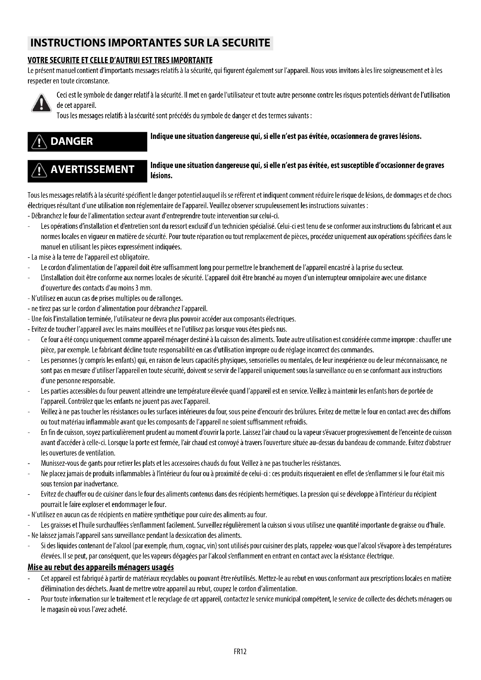 FR12 VOTRE SECURITE ET CELLE D’AUTRUI EST TRES IMPORTANTE Le présent manuel contient d’importants messages relatifs à la sécurité, qui figurent également sur l’appareil. Nous vous invitons à les lire soigneusement et à les respecter en toute circonstance. Tous les messages relatifs à la sécurité spécifient le danger potentiel auquel ils se réfèrent et indiquent comment réduire le risque de lésions, de dommages et de chocs électriques résultant d’une utilisation non réglementaire de l’appareil. Veuillez observer scrupuleusement les instructions suivantes : - Débranchez le four de l’alimentation secteur avant d’entreprendre toute intervention sur celui-ci. - Les opérations d’installation et d’entretien sont du ressort exclusif d’un technicien spécialisé. Celui-ci est tenu de se conformer aux instructions du fabricant et aux normes locales en vigueur en matière de sécurité. Pour toute réparation ou tout remplacement de pièces, procédez uniquement aux opérations spécifiées dans le manuel en utilisant les pièces expressément indiquées. - La mise à la terre de l’appareil est obligatoire. - Le cordon d’alimentation de l’appareil doit être suffisamment long pour permettre le branchement de l’appareil encastré à la prise du secteur. - L’installation doit être conforme aux normes locales de sécurité. L’appareil doit être branché au moyen d’un interrupteur omnipolaire avec une distance d’ouverture des contacts d’au moins 3 mm. - N’utilisez en aucun cas de prises multiples ou de rallonges. - ne tirez pas sur le cordon d’alimentation pour débranchez l’appareil. - Une fois l’installation terminée, l’utilisateur ne devra plus pouvoir accéder aux composants électriques. - Evitez de toucher l’appareil avec les mains mouillées et ne l’utilisez pas lorsque vous êtes pieds nus. - Ce four a été conçu uniquement comme appareil ménager destiné à la cuisson des aliments. Toute autre utilisation est considérée comme impropre : chauffer une pièce, par exemple. Le fabricant décline toute responsabilité en cas d’utilisation impropre ou de réglage incorrect des commandes. - Les personnes (y compris les enfants) qui, en raison de leurs capacités physiques, sensorielles ou mentales, de leur inexpérience ou de leur méconnaissance, ne sont pas en mesure d’utiliser l’appareil en toute sécurité, doivent se servir de l’appareil uniquement sous la surveillance ou en se conformant aux instructions d’une personne responsable. - Les parties accessibles du four peuvent atteindre une température élevée quand l’appareil est en service. Veillez à maintenir les enfants hors de portée de l’appareil. Contrôlez que les enfants ne jouent pas avec l’appareil. - Veillez à ne pas toucher les résistances ou les surfaces intérieures du four, sous peine d’encourir des brûlures. Evitez de mettre le four en contact avec des chiffons ou tout matériau inflammable avant que les composants de l’appareil ne soient suffisamment refroidis. - En fin de cuisson, soyez particulièrement prudent au moment d’ouvrir la porte. Laissez l’air chaud ou la vapeur s’évacuer progressivement de l’enceinte de cuisson avant d’accéder à celle-ci. Lorsque la porte est fermée, l’air chaud est convoyé à travers l’ouverture située au-dessus du bandeau de commande. Evitez d’obstruer les ouvertures de ventilation. - Munissez-vous de gants pour retirer les plats et les accessoires chauds du four. Veillez à ne pas toucher les résistances. - Ne placez jamais de produits inflammables à l’intérieur du four ou à proximité de celui-ci : ces produits risqueraient en effet de s’enflammer si le four était mis sous tension par inadvertance. - Evitez de chauffer ou de cuisiner dans le four des aliments contenus dans des récipients hermétiques. La pression qui se développe à l’intérieur du récipient pourrait le faire exploser et endommager le four. - N’utilisez en aucun cas de récipients en matière synthétique pour cuire des aliments au four. - Les graisses et l’huile surchauffées s’enflamment facilement. Surveillez régulièrement la cuisson si vous utilisez une quantité importante de graisse ou d’huile. - Ne laissez jamais l’appareil sans surveillance pendant la dessiccation des aliments. - Si des liquides contenant de l’alcool (par exemple, rhum, cognac, vin) sont utilisés pour cuisiner des plats, rappelez-vous que l’alcool s’évapore à des températures élevées. Il se peut, par conséquent, que les vapeurs dégagées par l’alcool s’enflamment en entrant en contact avec la résistance électrique. Mise au rebut des appareils ménagers usagés - Cet appareil est fabriqué à partir de matériaux recyclables ou pouvant être réutilisés. Mettez-le au rebut en vous conformant aux prescriptions locales en matière d’élimination des déchets. Avant de mettre votre appareil au rebut, coupez le cordon d’alimentation. - Pour toute information sur le traitement et le recyclage de cet appareil, contactez le service municipal compétent, le service de collecte des déchets ménagers ou le magasin où vous l’avez acheté.