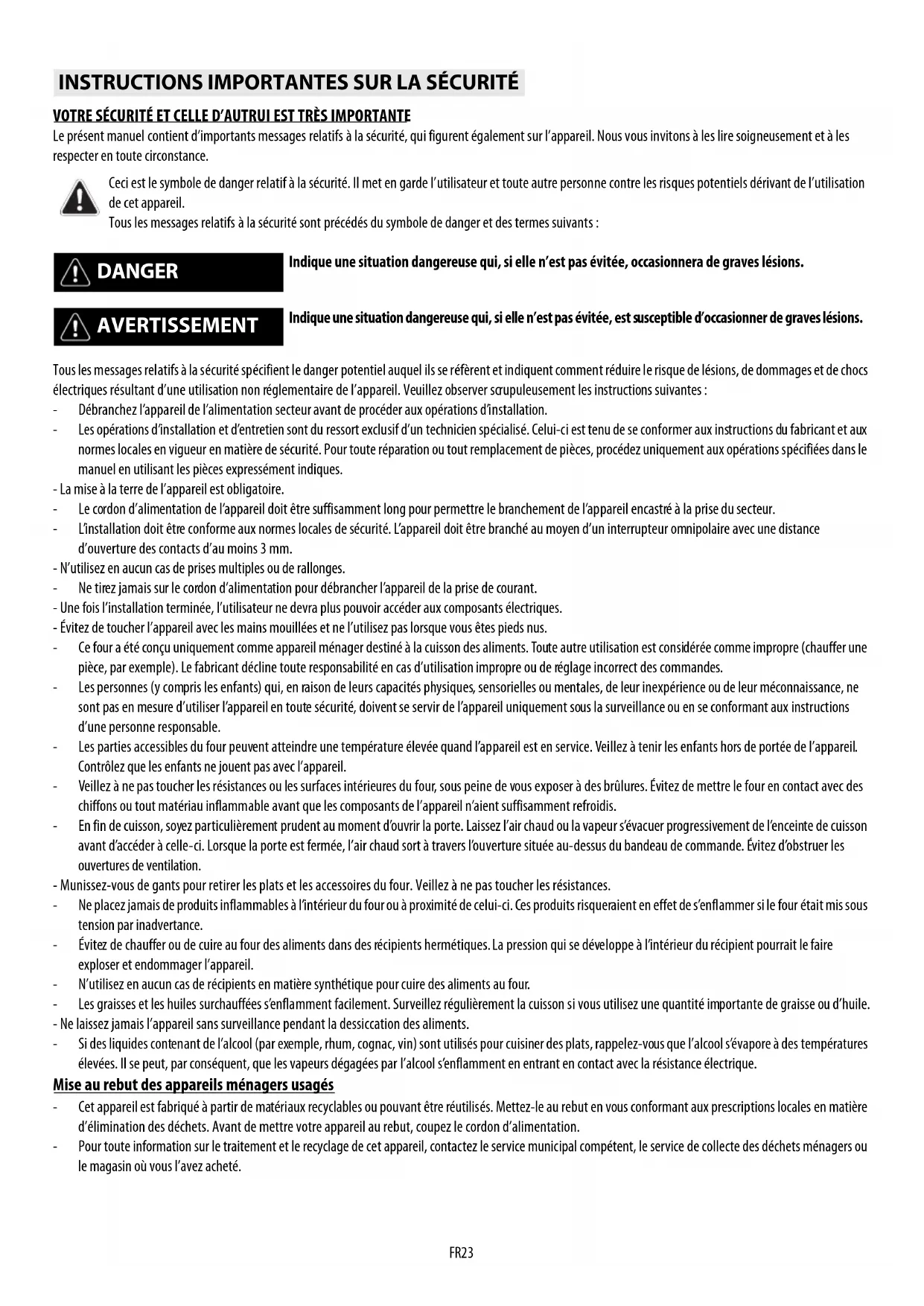 FR23 VOTRE SÉCURITÉ ET CELLE D’AUTRUI EST TRÈS IMPORTANTE Le présent manuel contient d’importants messages relatifs à la sécurité, qui figurent également sur l’appareil. Nous vous invitons à les lire soigneusement et à les respecter en toute circonstance. Tous les messages relatifs à la sécurité spécifient le danger potentiel auquel ils se réfèrent et indiquent comment réduire le risque de lésions, de dommages et de chocs électriques résultant d’une utilisation non réglementaire de l’appareil. Veuillez observer scrupuleusement les instructions suivantes : - Débranchez l’appareil de l’alimentation secteur avant de procéder aux opérations d’installation. - Les opérations d’installation et d’entretien sont du ressort exclusif d’un technicien spécialisé. Celui-ci est tenu de se conformer aux instructions du fabricant et aux normes locales en vigueur en matière de sécurité. Pour toute réparation ou tout remplacement de pièces, procédez uniquement aux opérations spécifiées dans le manuel en utilisant les pièces expressément indiques. - La mise à la terre de l’appareil est obligatoire. - Le cordon d’alimentation de l’appareil doit être suffisamment long pour permettre le branchement de l’appareil encastré à la prise du secteur. - L’installation doit être conforme aux normes locales de sécurité. L’appareil doit être branché au moyen d’un interrupteur omnipolaire avec une distance d’ouverture des contacts d’au moins 3 mm. - N’utilisez en aucun cas de prises multiples ou de rallonges. - Ne tirez jamais sur le cordon d’alimentation pour débrancher l’appareil de la prise de courant. - Une fois l’installation terminée, l’utilisateur ne devra plus pouvoir accéder aux composants électriques. - Évitez de toucher l’appareil avec les mains mouillées et ne l’utilisez pas lorsque vous êtes pieds nus. - Ce four a été conçu uniquement comme appareil ménager destiné à la cuisson des aliments. Toute autre utilisation est considérée comme impropre (chauffer une pièce, par exemple). Le fabricant décline toute responsabilité en cas d’utilisation impropre ou de réglage incorrect des commandes. - Les personnes (y compris les enfants) qui, en raison de leurs capacités physiques, sensorielles ou mentales, de leur inexpérience ou de leur méconnaissance, ne sont pas en mesure d’utiliser l’appareil en toute sécurité, doivent se servir de l’appareil uniquement sous la surveillance ou en se conformant aux instructions d’une personne responsable. - Les parties accessibles du four peuvent atteindre une température élevée quand l’appareil est en service. Veillez à tenir les enfants hors de portée de l’appareil. Contrôlez que les enfants ne jouent pas avec l’appareil. - Veillez à ne pas toucher les résistances ou les surfaces intérieures du four, sous peine de vous exposer à des brûlures. Évitez de mettre le four en contact avec des chiffons ou tout matériau inflammable avant que les composants de l’appareil n’aient suffisamment refroidis. - En fin de cuisson, soyez particulièrement prudent au moment d’ouvrir la porte. Laissez l’air chaud ou la vapeur s’évacuer progressivement de l’enceinte de cuisson avant d’accéder à celle-ci. Lorsque la porte est fermée, l’air chaud sort à travers l’ouverture située au-dessus du bandeau de commande. Évitez d’obstruer les ouvertures de ventilation. - Munissez-vous de gants pour retirer les plats et les accessoires du four. Veillez à ne pas toucher les résistances. - Ne placez jamais de produits inflammables à l’intérieur du four ou à proximité de celui-ci. Ces produits risqueraient en effet de s’enflammer si le four était mis sous tension par inadvertance. - Évitez de chauffer ou de cuire au four des aliments dans des récipients hermétiques. La pression qui se développe à l’intérieur du récipient pourrait le faire exploser et endommager l’appareil. - N’utilisez en aucun cas de récipients en matière synthétique pour cuire des aliments au four. - Les graisses et les huiles surchauffées s’enflamment facilement. Surveillez régulièrement la cuisson si vous utilisez une quantité importante de graisse ou d’huile. - Ne laissez jamais l’appareil sans surveillance pendant la dessiccation des aliments. - Si des liquides contenant de l’alcool (par exemple, rhum, cognac, vin) sont utilisés pour cuisiner des plats, rappelez-vous que l’alcool s’évapore à des températures élevées. Il se peut, par conséquent, que les vapeurs dégagées par l’alcool s’enflamment en entrant en contact avec la résistance électrique. Mise au rebut des appareils ménagers usagés - Cet appareil est fabriqué à partir de matériaux recyclables ou pouvant être réutilisés. Mettez-le au rebut en vous conformant aux prescriptions locales en matière d’élimination des déchets. Avant de mettre votre appareil au rebut, coupez le cordon d’alimentation. - Pour toute information sur le traitement et le recyclage de cet appareil, contactez le service municipal compétent, le service de collecte des déchets ménagers ou le magasin où vous l’avez acheté.