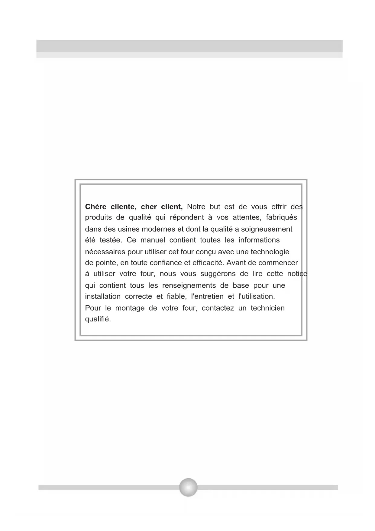 Chère cliente, cher client, notre but est de vous offrir des produits de qualité qui répondent à vos attentes, fabriqués dans des usines modernes et dont la qualité a soigneusement été testée. Ce manuel contient toutes les informations nécessaires pour utiliser cet four conçu avec une technologie de pointe, en toute confiance et efficacité. Avant de commencer à utiliser votre four, nous vous suggérons de lire cette notice qui contient tous les renseignements de base pour une installation correcte et fiable, l'entretien et l'utilisation. Pour le montage de votre four, contactez un technicien qualifié.