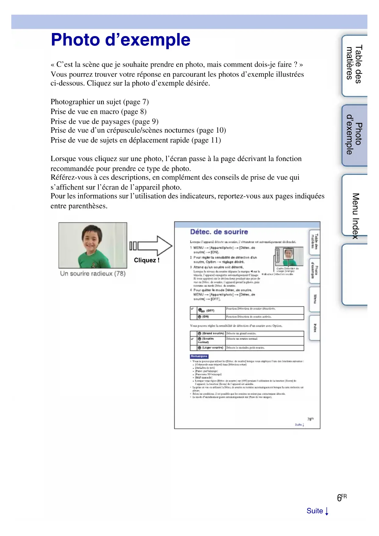 Table des matières Photo d’exemple Menu Index Photo d’exemple « C’est la scène que je souhaite prendre en photo, mais comment dois-je faire ? » Vous pourrez trouver votre réponse en parcourant les photos d’exemple illustrées ci-dessous. Cliquez sur la photo d’exemple désirée. Photographier un sujet (page 7) Prise de vue en macro (page 8) Prise de vue de paysages (page 9) Prise de vue d’un crépuscule/scènes nocturnes (page 10) Prise de vue de sujets en déplacement rapide (page 11) Lorsque vous cliquez sur une photo, l’écran passe à la page décrivant la fonction recommandée pour prendre ce type de photo. Référez-vous à ces descriptions, en complément des conseils de prise de vue qui s’affichent sur l’écran de l’appareil photo. Pour les informations sur l’utilisation des indicateurs, reportez-vous aux pages indiquées entre parenthèses. Cliquez ! Suite r7