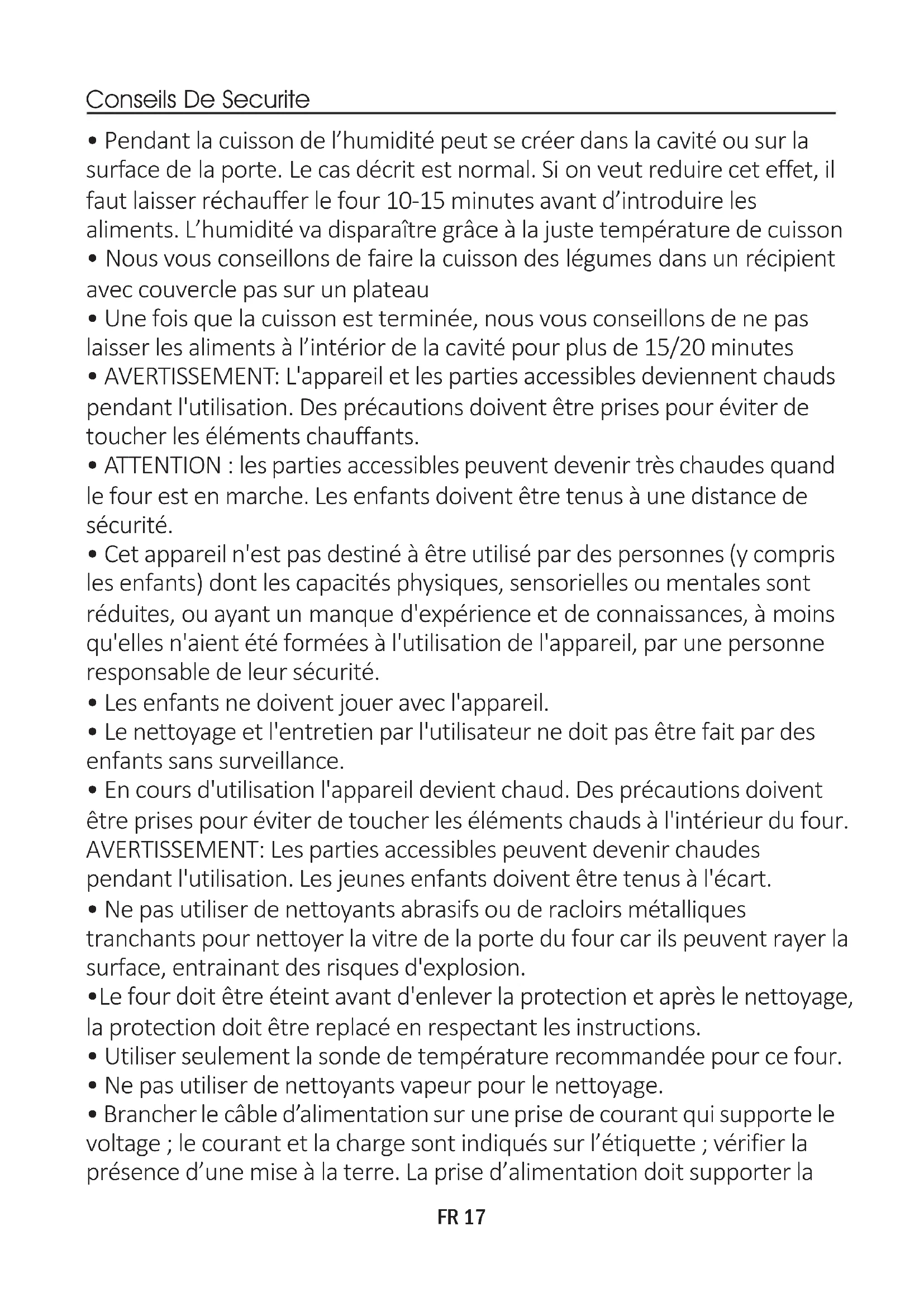 UN PREMIER NETTOYAGE doit être réalisé avant la première utilisation passer un chiffon doux et humide sur les surfaces extérieures de l'appareil. Nettoyer avec une éponge additionnée de produit lessiviel, les accessoires et l'intérieur du four. Rincer et sécher. Faire chauffer le four à vide une bonne heure à la température maximale pour faire disparaître l'odeur du neuf. Pendant cette opération, bien aérerla pièce.NB : ce dispositif est fonctionnel une fois que le programme de cuisson est activé. Appuyez deux fois de suite sur le bouton EXTRA et déterminez le temps de cuisson en vous aidant des touches "+" et "-". Une fois que le temps souhaité est atteint, appuyez sur la touche SELECT. L'écran affiche "00:00" si la durée de cuisson n'a pas été insérée. Dans le cas échéant, l'écran affiche le tempsrestant. Quand le programmme de cuisson prend fin, le four s'éteint et l'écran affiche "END" (l'icone du programme de cuisson reste allumée). Pour l'éteindreil faut appuyer sur le bouton On/Off. Une alarme retentit pour vous prévenir que le programme de cuisson est terminé. Lors que le temps de cuisson est écoulé, le four s'éteint automatiquement et une alarme se déclenche et dure quelques secondes. FONCTION COMMENT LE DESACTIVER FONCTION PRINCIPALE POURQUOI QUELS BESOINS ? DUREE DE CUISSON REGLAGE DE L'HEURE MINUTEUR COMMENT L'UTILISER NB : ce dispositif est fonctionnel une fois que le programme de cuisson est activé. Appuyez sur le bouton EXTRA suffisamment longtemps pour que l'icone s'allume. Determinez la fin du temps de cuisson en utilisant les boutons "<" et ">" et confirmez la sélection en appuyant sur le bouton "SELECT". La durée de cuison est automatiquement calculée. Cette fonction peut aussi être utilisée pour les cuissons qui peuvent être programmées en avance. Si un programmede cuisson est sélectionné, n'appuyez pas sur le bouton "F", sinon vos données serontperdues. Si le départ différé est programmé, le four s'éteint et l'écran affiche l'heure pendant que les fonctions de cuisson, temps de cuisson et fin de cuisson sont allumés. Si un programmede cuisson est sélectionné en cliquant sur les touches "<" et ">", vous pourrez voir la température en appuyant une première fois, et la modifier en appuyant de nouveau. Pour modifier le temps de fin de cuisson, appuyez suffisamment longtemps sur le bouton EXTRA, jusqu'a ce que le voyant s'allume. Ensuite, choisissez le nouveau temps de cuisson restant en vous aidant des touches "<" et ">", appuyez sur le bouton "SELECT" pour confirmer le nouveau tempschoisi. Pour annuler la fin de cuisson, il suffit de réinitialiserl'écranà00:00 Quand le programmme de cuisson prend fin, le four s'éteint et l'écran affiche "END"( l'icone du programme de cuisson reste allumée). Pour l'éteindre il faut appuyer sur le bouton On/Off. Une alarme retentit pour vous prévenir que le programme de cuisson est terminé. Cette fonction est utile lorsque les enfants sont à la maison. Appuyez sur le bouton EXTRA suffisamment longtemps pour que le voyant s'allume. Puis appuyer sur la touche "<" ou ">" pour activer cette fonction. L'écran affichera "ON", pour confirmer la sélection il suffit d'appuyer sur le bouton "SELECT". Appuyez sur le bouton EXTRA suffisamment longtemps pour que le voyant s'allume. Puis appuyer sur la touche "<" ou ">" pour désactiver cette fonction. L'écran affichera "OFF", pour confirmer votre sélection il suffit d'appuyer sur le bouton"SELECT". Si la fonction est activée , seul la touche EXTRA et On/Off peut alors être utilisé. L'alarme s'enchlenche même si le four n'est pas allumé. Quand on met en marche cette fonction pour la première fois, l'écran s'allume et indique 12:00. Pour modifier l'heure appuyer sur EXTRA suffisamment longtemps jusqu’à ce que le voyant s'allume puis tiliser les touches"<" et ">". Cette fonction permet de sélectionner le temps qui apparaîtra sur votre écran. Si aucun temps n'a été inséré ou si le temps restant de cuisson est écoulé l'écran affiche 00:00 Pour modifier le minuteur, appuyer sur la touche EXTRA assez longtemps jusqu’à ce qu'elle s'allume. Une fois allumée, vous pouvez régler la durée de cuisson en appuyant sur les boutons "<" et ">". Une fois le temps recherché obtenu, appuyer sur "SELECT" pour confirmervotresélection. Cette fonction sert à activer une alarme qui se déclenchera une fois que le temps de cuisson prendra fin. Attention : cette fonction n'éteint pas le four. Vous pouvez choisir une période de temps qui variede 00:00 à 23:53 Le minuteur s'enchlenche même si le four n'est pas allumé. Pour modifier le temps de cuisson, appuyez deux fois sur le bouton EXTRA et choissisez le nouveau temps de cuisson en vous aidant des touches "<" et ">", appuyez sur le bouton "SELECT" pour confirmer le nouveautempschoisi. Pour annuler le temps de cuisson restant, il suffit de réinitialiserl'écranà00:00 SECURITE ENFANT FIN DE CUISSSON FR 25La touche "EXTRA" qui se trouve sur l'écran d'affichage permetde sélectionner le menu WIFI. Si vous appuyersur les boutons"<>" vous pouvez sélectionner les fonctions suivantes : - ( Wi-fi nonconnecté ) :Lefournepeutpasêtrecontrôléparl'applicationOff - ( Wi-fi connecté) : le WIFI est activé et uniquement l'application contrôle le four, ce qui signifie qu'ilOn est impossible de sélectionner les fonctions : cuisson, recette et température sur l'écran d'affichage. Le menu WIFI s'affiche uniquement lorsque vous appuyez sur la touche "EXTRA". Vous pouvez éteindre le four en utilisant les boutons Marche/Arrêt mais vous ne pouvez pas le rallumer à partir de l'écran d'affichage. Vousne pouvezallumer le fourqu'à partir de l'application. - (Réinitialisation) : Cette fonction doit être utilisée lors de la première connection du four auReset réseau WI-FI ou lorsqu'il faut réinitialiser le réseau WIFI si l'on veut que le four se connecte automatiquement à un au