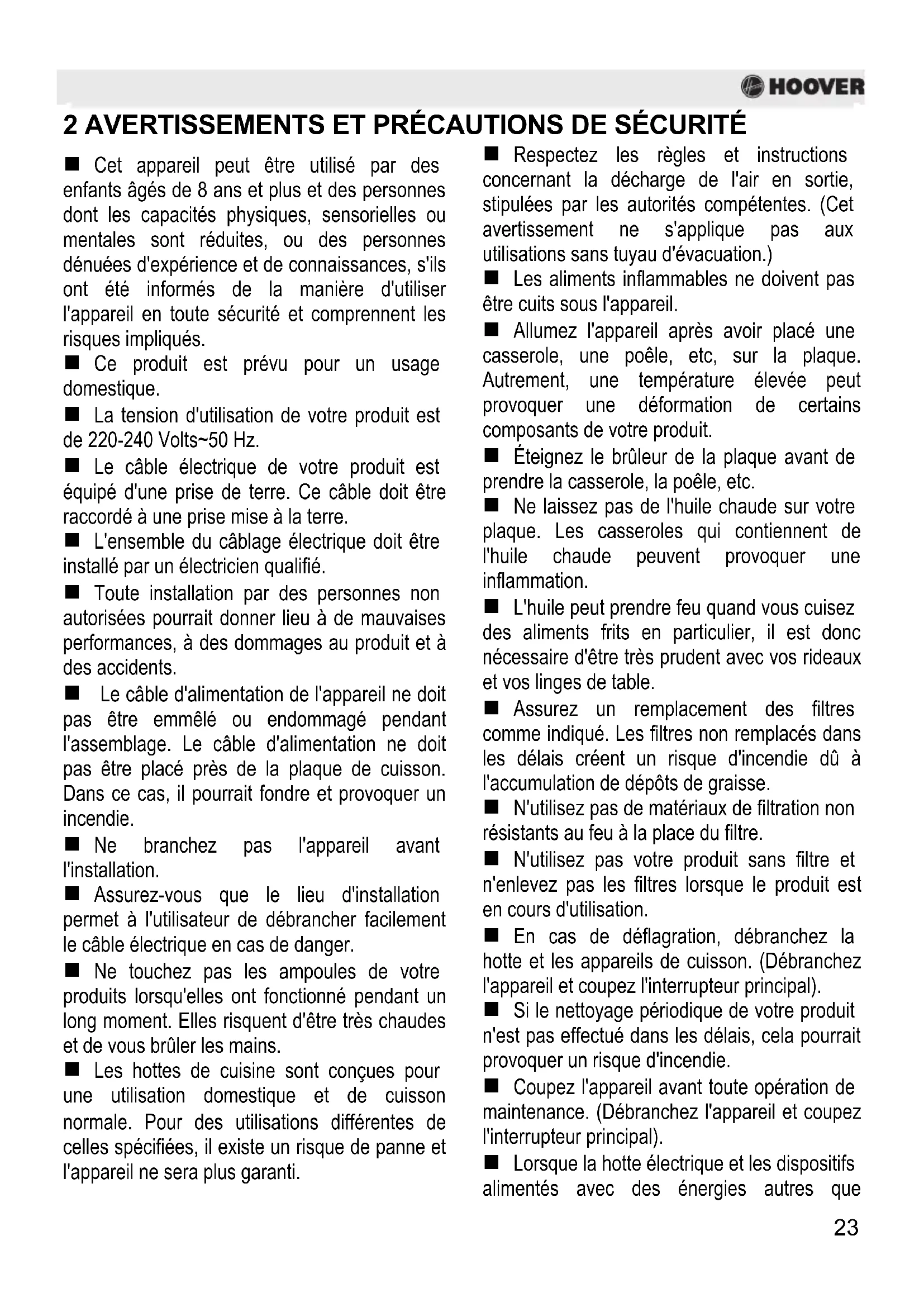 2 AVERTISSEMENTS ET PRÉCAUTIONS DE SÉCURITÉ Cet appareil peut être utilisé par des enfants âgés de 8 ans et plus et des personnes dont les capacités physiques, sensorielles ou mentales sont réduites, ou des personnes dénuées d'expérience et de connaissances, s'ils ont été informés de la manière d'utiliser l'appareil en toute sécurité et comprennent les risques impliqués. Ce produit est prévu pour un usage domestique. La tension d'utilisation de votre produit est de 220-240 Volts~50 Hz. Le câble électrique de votre produit est équipé d'une prise de terre. Ce câble doit être raccordé à une prise mise à la terre. L'ensemble du câblage électrique doit être installé par un électricien qualifié. Toute installation par des personnes non autorisées pourrait donner lieu à de mauvaises performances, à des dommages au produit et à des accidents. Le câble d'alimentation de l'appareil ne doit pas être emmêlé ou endommagé pendant l'assemblage. Le câble d'alimentation ne doit pas être placé près de la plaque de cuisson. Dans ce cas, il pourrait fondre et provoquer un incendie. Ne branchez pas l'appareil avant l'installation. Assurez-vous que le lieu d'installation permet à l'utilisateur de débrancher facilement le câble électrique en cas de danger. Ne touchez pas les ampoules de votre produits lorsqu'elles ont fonctionné pendant un long moment. Elles risquent d'être très chaudes et de vous brûler les mains. Les hottes de cuisine sont conçues pour une utilisation domestique et de cuisson normale. Pour des utilisations différentes de celles spécifiées, il existe un risque de panne et l'appareil ne sera plus garanti. Respectez les règles et instructions concernant la décharge de l'air en sortie, stipulées par les autorités compétentes. (Cet avertissement ne s'applique pas aux utilisations sans tuyau d'évacuation.) Les aliments inflammables ne doivent pas être cuits sous l'appareil. Allumez l'appareil après avoir placé une casserole, une poêle, etc, sur la plaque. Autrement, une température élevée peut provoquer une déformation de certains composants de votre produit. Éteignez le brûleur de la plaque avant de prendre la casserole, la poêle, etc. Ne laissez pas de l'huile chaude sur votre plaque. Les casseroles qui contiennent de l'huile chaude peuvent provoquer une inflammation. L'huile peut prendre feu quand vous cuisez des aliments frits en particulier, il est donc nécessaire d'être très prudent avec vos rideaux et vos linges de table. Assurez un remplacement des filtres comme indiqué. Les filtres non remplacés dans les délais créent un risque d'incendie dû à l'accumulation de dépôts de graisse. N'utilisez pas de matériaux de filtration non résistants au feu à la place du filtre. N'utilisez pas votre produit sans filtre et n'enlevez pas les filtres lorsque le produit est en cours d'utilisation. En cas de déflagration, débranchez la hotte et les appareils de cuisson. (Débranchez l'appareil et coupez l'interrupteur principal). Si le nettoyage périodique de votre produit n'est pas effectué dans les délais, cela pourrait provoquer un risque d'incendie. Coupez l'appareil avant toute opération de maintenance. (Débranchez l'appareil et coupez l'interrupteur principal). Lorsque la hotte électrique et les dispositifs alimentés avec des énergies autres que24 l'électricité fonctionnent simultanément, la pression négative dans la pièce ne doit pas dépasser 4 Pa ( 4 X 10 bars ). Des appareils alimentés au gaz ou au fuel, comme les chauffages, qui partagent le même environnement avec votre produit, doivent être totalement isolés de l'évacuation de ce produit ou ils doivent être hermétiques. Lorsque vous prévoyez une connexion à l'évacuation pour votre produit, utilisez des tuyaux ayant un diamètre de 150 mm ou 120 mm. Le raccordement au tuyau ainsi que le nombre de coudes doivent être les plus petits possibles. Les enfants ne doivent pas jouer avec l'appareil. Pour votre sécurité, utilisez un fusible ”MAX 6 A” dans le système de la hotte. Les matériaux d'emballage peuvent être dangereux, gardez-les hors de portée des enfants. Si le câble d'alimentation est endommagé, il doit être remplacé par son fabricant ou un service technique agréé ou tout autre personnel qualifié au même niveau, afin d'éviter toute situation dangereuse. En cas de déflagration, débranchez la hotte et les appareils de cuisson et couvrez la flamme. N'utilisez jamais d'eau pour éteindre le feu. Lorsque les appareils de cuisson sont en cours de fonctionnement, leurs pièces accessibles peuvent être chaudes. Cet appareil n'est pas destiné à être utilisé par des personnes ayant des handicaps physiques, sensoriels et mentaux (y compris les enfants) ou celles n'ayant pas l'expérience et les connaissances adéquates concernant son utilisation, sauf s'ils sont sous la supervision d'une personne responsable de la sécurité de l'appareil. Après l'installation de la hotte, la distance minimum doit être de 65 cm entre le produit et toute plaque de cuisson électrique et de 75 cm entre le produit et des plaques de cuisson à gaz ou alimentées avec d'autres combustibles. La sortie de la hotte ne doit pas être connectée aux conduits d'air, lorsqu'il existe d'autres fumées. Vous devez faire attention lors de l'utilisation de l'appareil spontanément avec d'autres appareils (par ex, chauffages à gaz, combustibles diesel, charbon ou bois, chauffages de douche, etc). Il convient d'être très prudent lorsque vous les utilisez simultanément. En effet, la hotte pourrait affecter de manière négative la combustion, en déchargeant l'air ambiant. Cet avertissement ne s'applique pas aux utilisations sans tuyau d'évacuation. Lorsque la hotte électrique est utilisée simultanément avec des dispositifs qui utilisent du gaz ou d'autres combustibles, il doit y avoir une ventilation suffisante dans la pièce (cela ne s'a