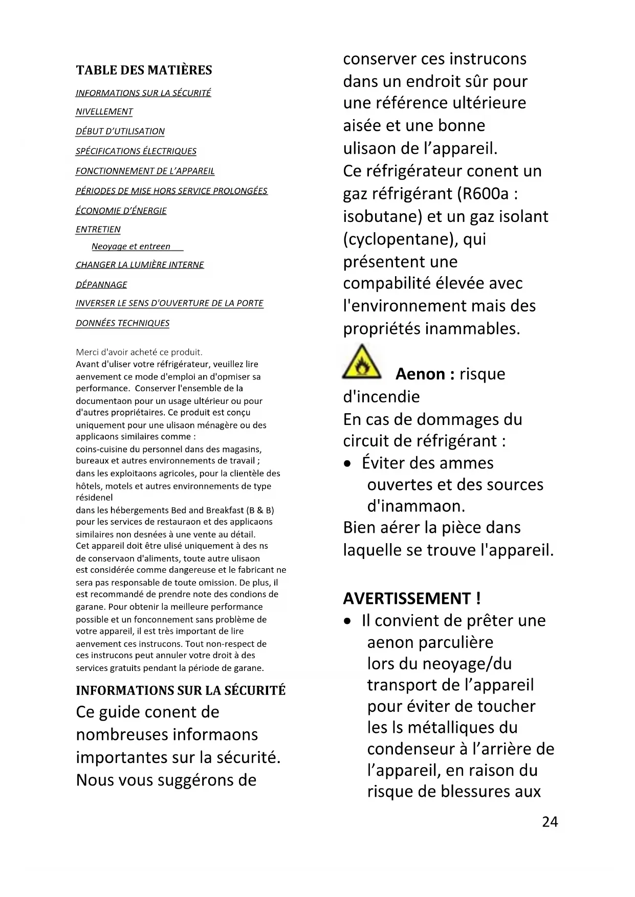 Ce guide contient de nombreuses informations importantes sur la sécurité. Nous vous suggérons de conserver ces instructions dans un endroit sûr pour une référence ultérieure aisée et une bonne utilisation de l’appareil. Ce réfrigérateur contient un gaz réfrigérant (R600a : isobutane) et un gaz isolant (cyclopentane), qui présentent une compatibilité élevée avec l'environnement mais des propriétés inflammables. Attention : risque d'incendie En cas de dommages du circuit de réfrigérant :
