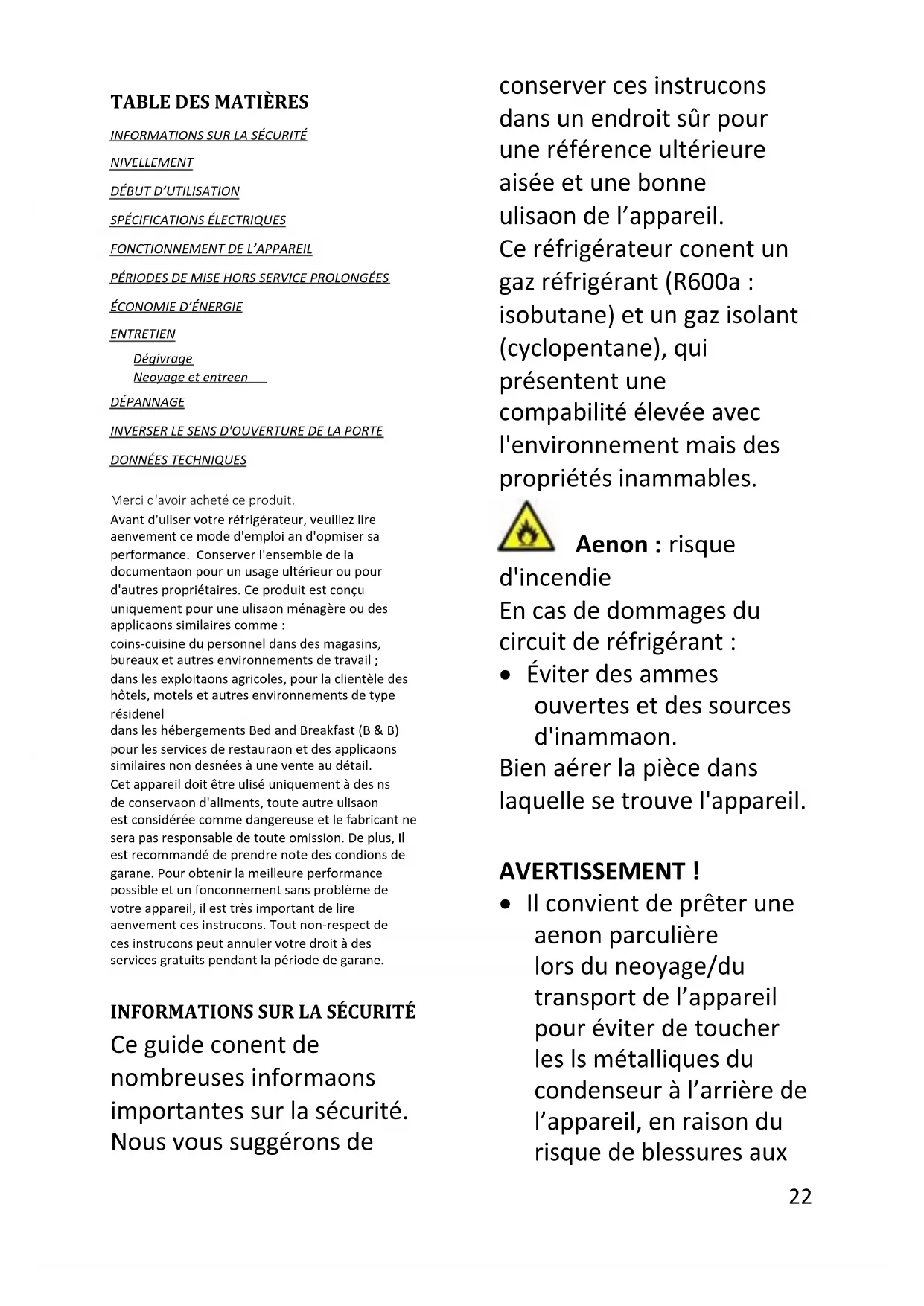 Ce guide contient de nombreuses informations importantes sur la sécurité. Nous vous suggérons de conserver ces instructions dans un endroit sûr pour une référence ultérieure aisée et une bonne utilisation de l’appareil. Ce réfrigérateur contient un gaz réfrigérant (R600a : isobutane) et un gaz isolant (cyclopentane), qui présentent une compatibilité élevée avec l'environnement mais des propriétés inflammables. Attention : risque d'incendie En cas de dommages du circuit de réfrigérant :
