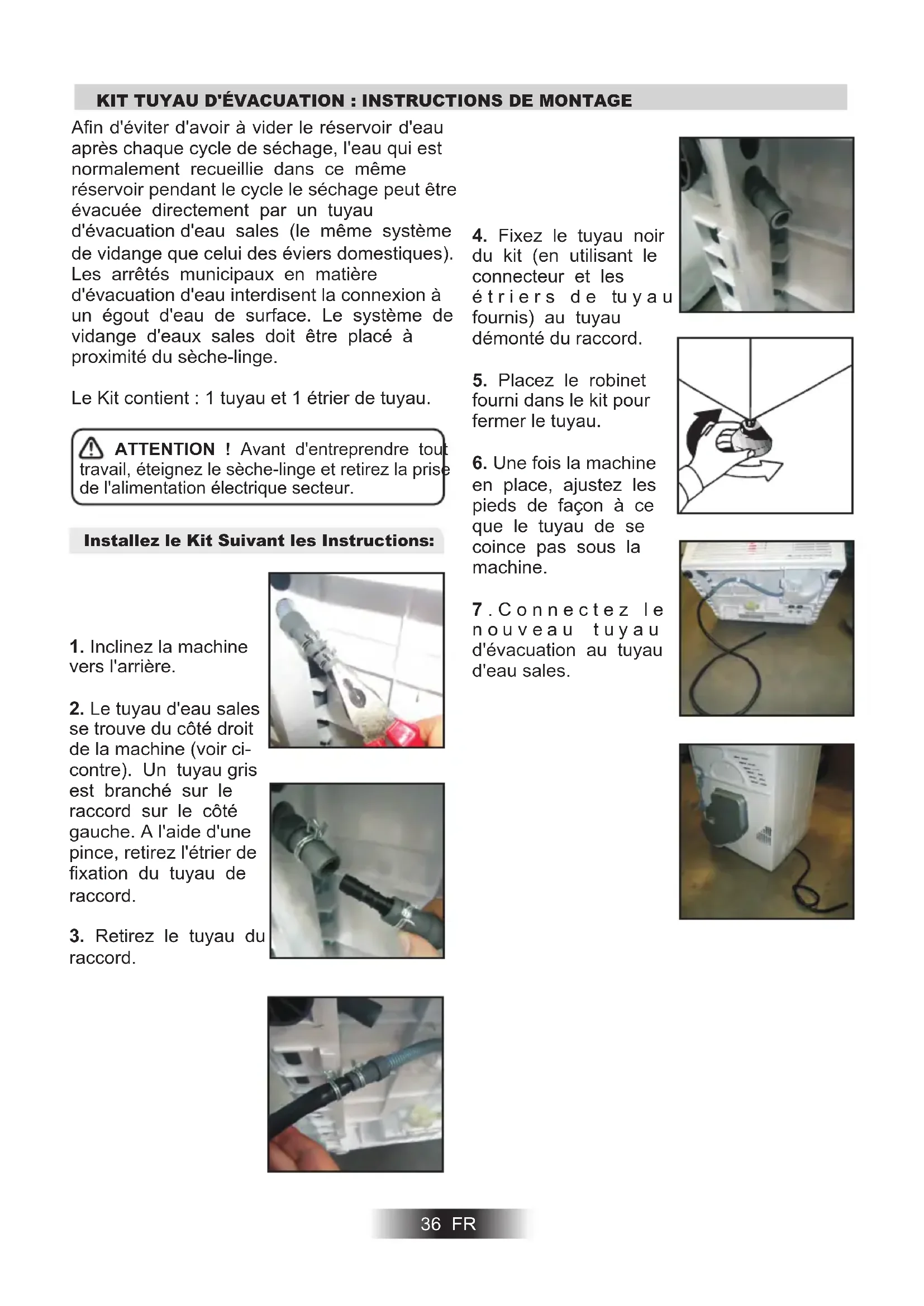 Afin d'eviter d'avoir à vider le réservoir d'eau après chaque cycle de séchage, l'eau qui est normalement recueillie dans ce même réservoir pendant le cycle le séchage peut être evacuée directement par un tuyau d'évacuation d'eau sales (le même système de vidange que celui des éviers domestiques). Les arrêtés municipaux en matière d'évacuation d'eau interdisent la connexion à unégout d'eau de surface. Le système de vidange d'eaux sales doit être place à proximé du séche-linge.