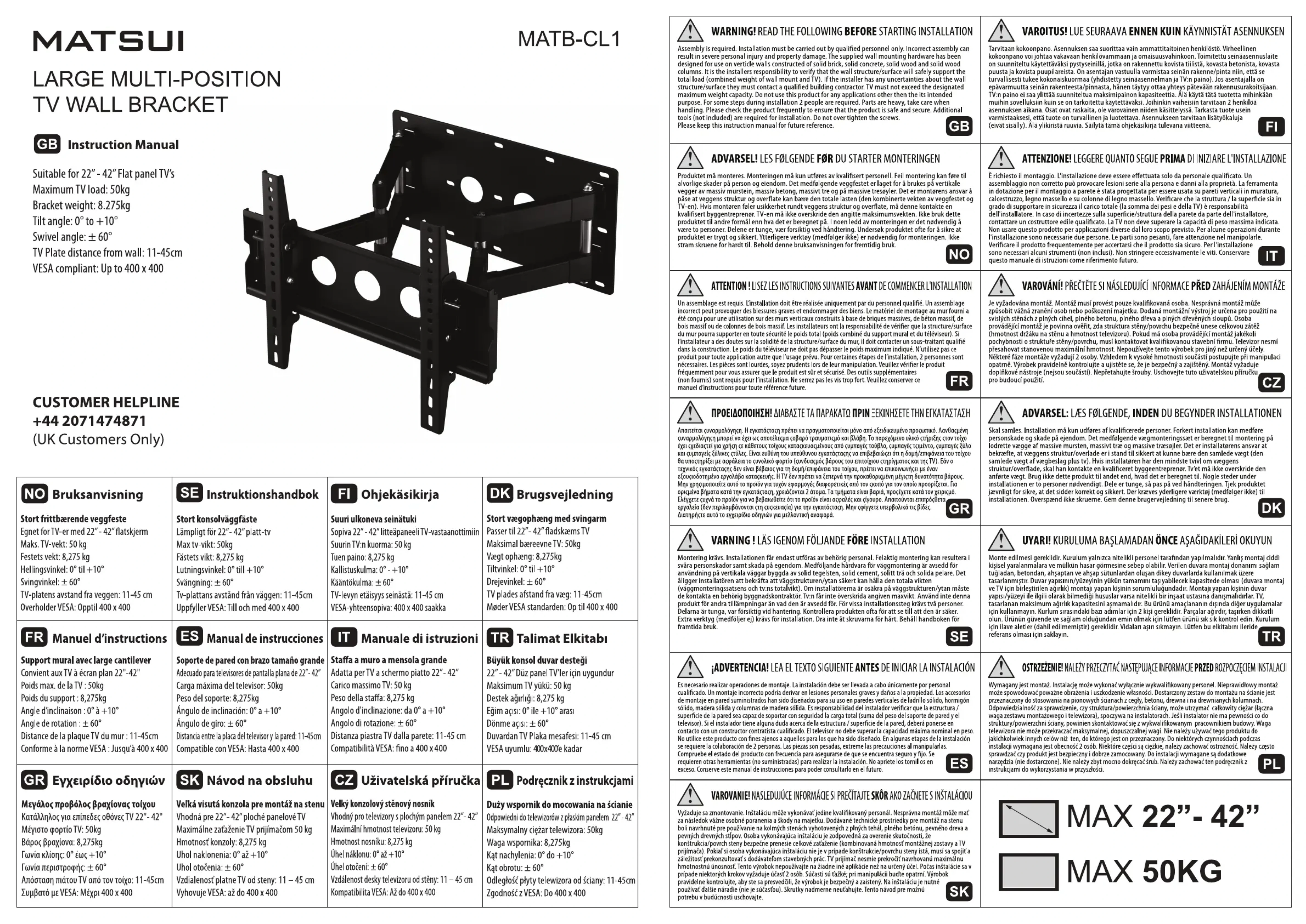 Support mural with large cantilever Convient aux TV à écran plan 22^ - 42^ Poids max. de la TV: 50kg Poids du support: 8,275kg Angle d'incinuation: 0^ + 10^ Angle de rotation: ± 60^ Distance de la plaque TV du mur: 11 - 45cm Conformée à la norme VESA: Jusqu'400 m