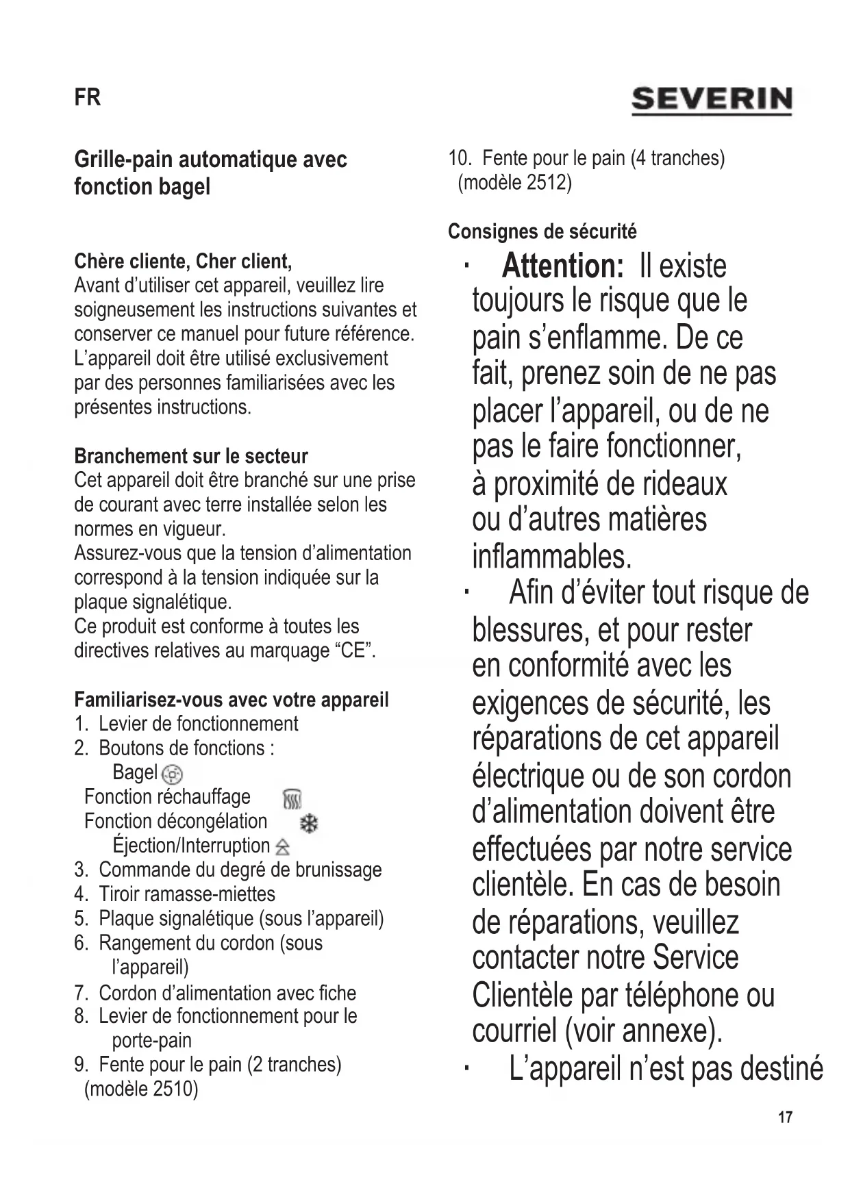 (modèle 2512) Consignes de sécurité ∙ Attention : Il existe toujours le risque que le pain s’enamme. De ce fait, prenez soin de ne pas placer l’appareil, ou de ne pas le faire fonctionner, à proximité de rideaux ou d’autres matières inammables. ∙ An d’éviter tout risque de blessures, et pour rester en conformité avec les exigences de sécurité, les réparations de cet appareil électrique ou de son cordon d’alimentation doivent être effectuées par notre service clientèle. En cas de besoin de réparations, veuillez contacter notre Service Clientèle par téléphone ou courriel (voir annexe). ∙ L’appareil n’est pas destiné FR18 104 x 142 mm à être utilisé avec un programmateur externe ou une télécommande indépendante. ∙ Débranchez toujours la che de la prise murale et laissez refroidir avant de nettoyer l’appareil. ∙ Pour éviter le risque de chocs électriques, ne pas nettoyer l’appareil avec du liquide et ne pas le plonger dans du liquide. ∙ Pour nettoyer l’appareil, il suft d’en essuyer l’extérieur avec un chiffon légèrement humide. ∙ Pour enlever les miettes, enfoncez le tiroir ramasse- miettes un bref instant avant de le retirer. Videz le tiroir et remettez-le en place. ∙ Cet appareil est destiné à être utilisé dans des applications domestiques et analogues telles que : - des coins cuisines réservés au personnel dans des magasins, bureaux et autres environnements professionnels ; - des fermes ; - l’utilisation par les clients des hôtels, motels et autres environnements à caractère résidentiel ; - des environnements de type chambres d’hôtes. ∙ Cet appareil peut être utilisé par des enfants (à partir de 8 ans) et par des personnes souffrant de déciences physiques, sensorielles ou mentales, ou manquant d’expérience ou de connaissances, s’ils ont été formés à l’utilisation de l’appareil et ont été supervisés, et s’ils en comprennent les dangers104 x 142 mm