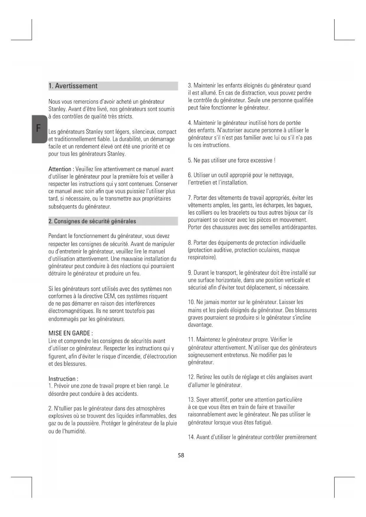 Nous vous remercions d'avoir acheté un générateur Stanley. Avant d'être livré, nos générateurs sont soumis à des contrôles de qualité très stricts. Les générateurs Stanley sont légers, silencieux, compact et traditionnellement fiable. La durabilité, un démarrage facile et un rendement élevé ont été une priorité et ce pour tous les générateurs Stanley. Attention : Veuillez lire attentivement ce manuel avant d'utiliser le générateur pour la première fois et veiller à respecter les instructions qui y sont contenues. Conserver ce manuel avec soin afin que vous puissiez l'utiliser plus tard, si nécessaire, ou le transmettre aux propriétaires subséquents du générateur.