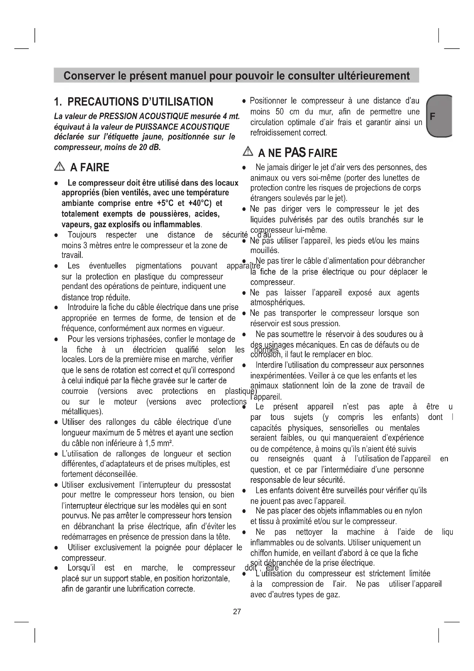 La valeur de PRESSION ACOUSTIQUE mesurée 4 mt. équivaut à la valeur de PUISSANCE ACOUSTIQUE déclarée sur l’étiquette jaune, positionnée sur le compresseur, moins de 20 dB. A FAIRE ● Le compresseur doit être utilisé dans des locaux appropriés (bien ventilés, avec une température ambiante comprise entre +5°C et +40°C) et totalement exempts de poussières, acides, vapeurs, gaz explosifs ou inflammables. ● Toujours respecter une distance de sécurité d’au moins3mètresentrelecompresseuretlazonede travail. ● Les éventuelles pigmentations pouvant apparaître sur la protection en plastique du compresseur pendant des opérations de peinture, indiquent une distancetropréduite. ● Introduire la fiche du câble électrique dans une prise appropriée en termes de forme, de tension et de fréquence,conformémentauxnormesenvigueur. ● Pourlesversionstriphasées,confierlemontagede la fiche à un électricien qualifié selon les normes locales.Lorsdelapremièremiseenmarche,vérifier que le sens de rotation est correct et qu’il correspond àceluiindiquéparlaflèchegravéesurlecarterde courroie (versions avec protections en plastique) ou sur le moteur (versions avec protections métalliques). ● Utiliser des rallonges du câble électrique d’une longueurmaximumde5mètresetayantunesection ducâblenoninférieureà1,5mm². ● L’utilisation de rallonges de longueur et section différentes, d’adaptateurs et de prises multiples, est fortementdéconseillée.