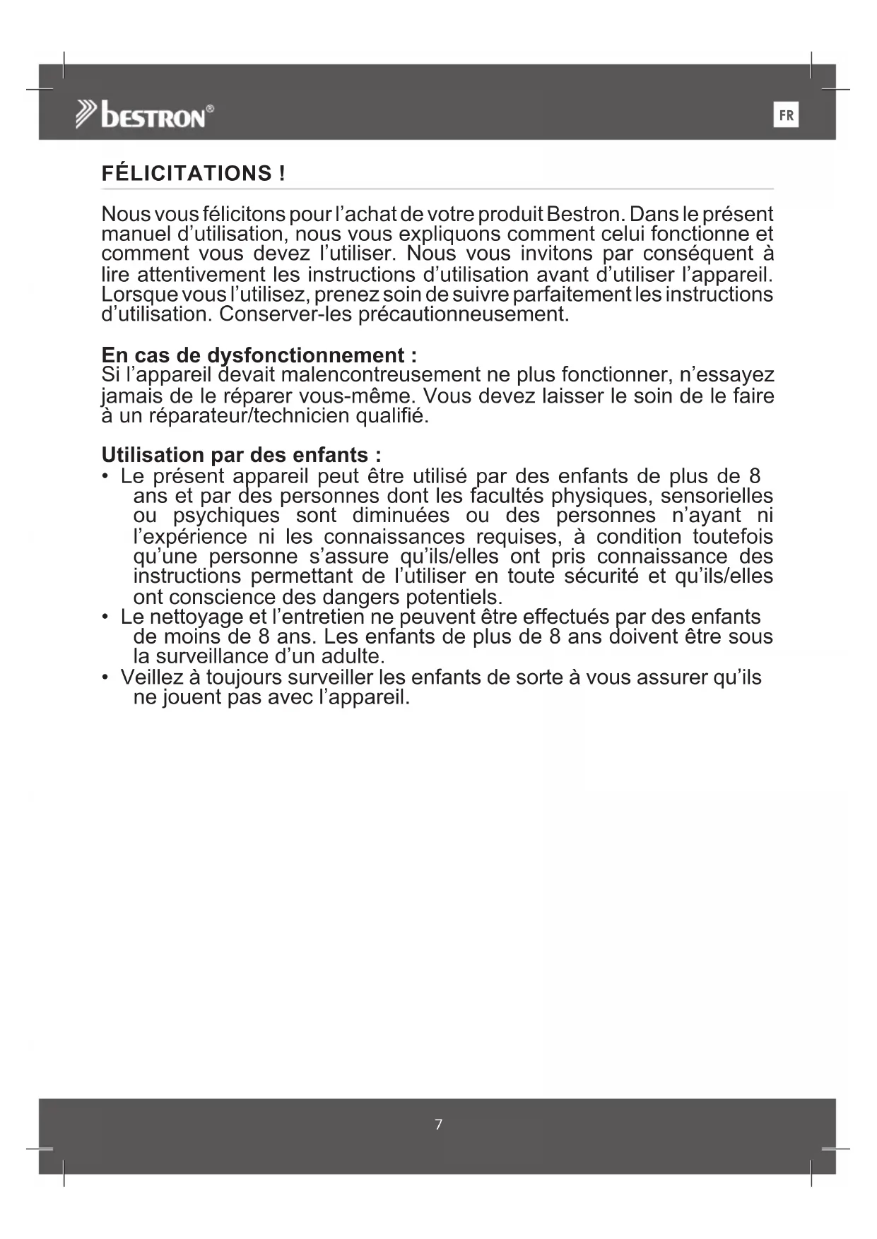 DEFÉLICITATIONS ! Nous vous félicitons pour l’achat de votre produit Bestron. Dans le présent manuel d’utilisation, nous vous expliquons comment celui fonctionne et comment vous devez l’utiliser. Nous vous invitons par conséquent à lire attentivement les instructions d’utilisation avant d’utiliser l’appareil. Lorsque vous l’utilisez, prenez soin de suivre parfaitement les instructions d’utilisation. Conserver-les précautionneusement. En cas de dysfonctionnement : Si l’appareil devait malencontreusement ne plus fonctionner, n’essayez jamais de le réparer vous-même. Vous devez laisser le soin de le faire à un réparateur/technicien qualifié. Utilisation par des enfants :