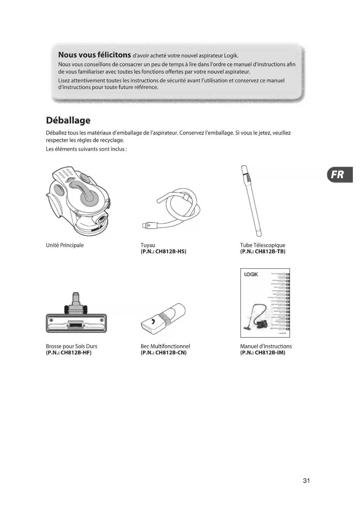 Déballage Déballez tous les matériaux d’emballage de l’aspirateur. Conservez l’emballage. Si vous le jetez, veuillez respecter les règles de recyclage. Les éléments suivants sont inclus : Nous vous félicitons d’avoir acheté votre nouvel aspirateur Logik. Nous vous conseillons de consacrer un peu de temps à lire dans l’ordre ce manuel d’instructions an de vous familiariser avec toutes les fonctions oertes par votre nouvel aspirateur. Lisez attentivement toutes les instructions de sécurité avant l’utilisation et conservez ce manuel d’instructions pour toute future référence. Unité Principale Brosse pour Sols Durs (P.N.: CH812B-HF) Tuyau (P.N.: CH812B-HS) Bec Multifonctionnel (P.N.: CH812B-CN) Tube Télescopique (P.N.: CH812B-TB) Manuel d’Instructions (P.N.: CH812B-IM)32