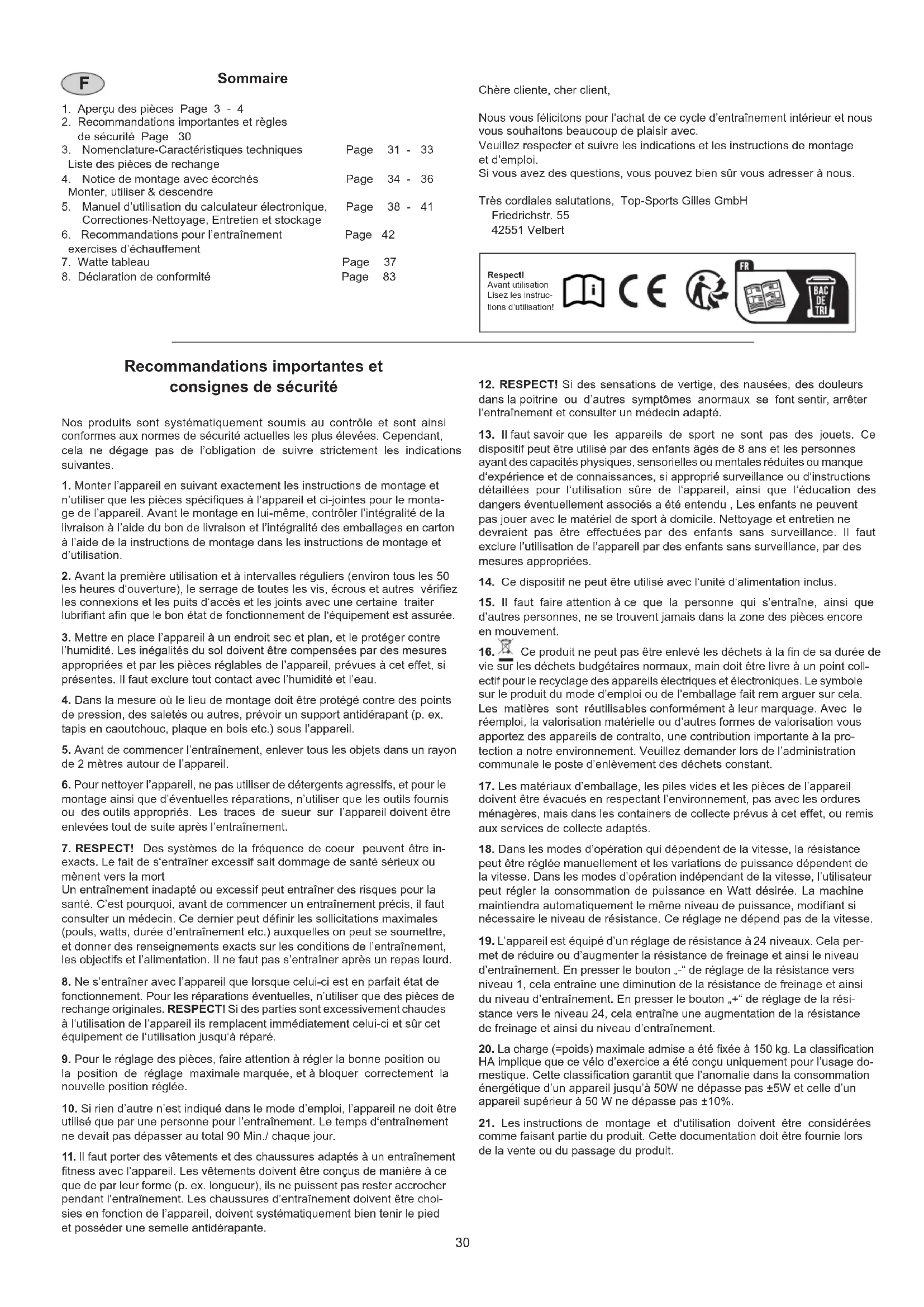 comme faisant partie du produit. Cette documentation doit être fournie lors de la vente ou du passage du produit. Chère cliente, cher client, Nous vous félicitons pour l’achat de ce cycle d’entraînement intérieur et nous vous souhaitons beaucoup de plaisir avec. Veuillez respecter et suivre les indications et les instructions de montage et d’emploi. Si vous avez des questions, vous pouvez bien sûr vous adresser à nous. Très cordiales salutations, Top-Sports Gilles GmbH Friedrichstr. 55 42551 Velbert Sommaire
