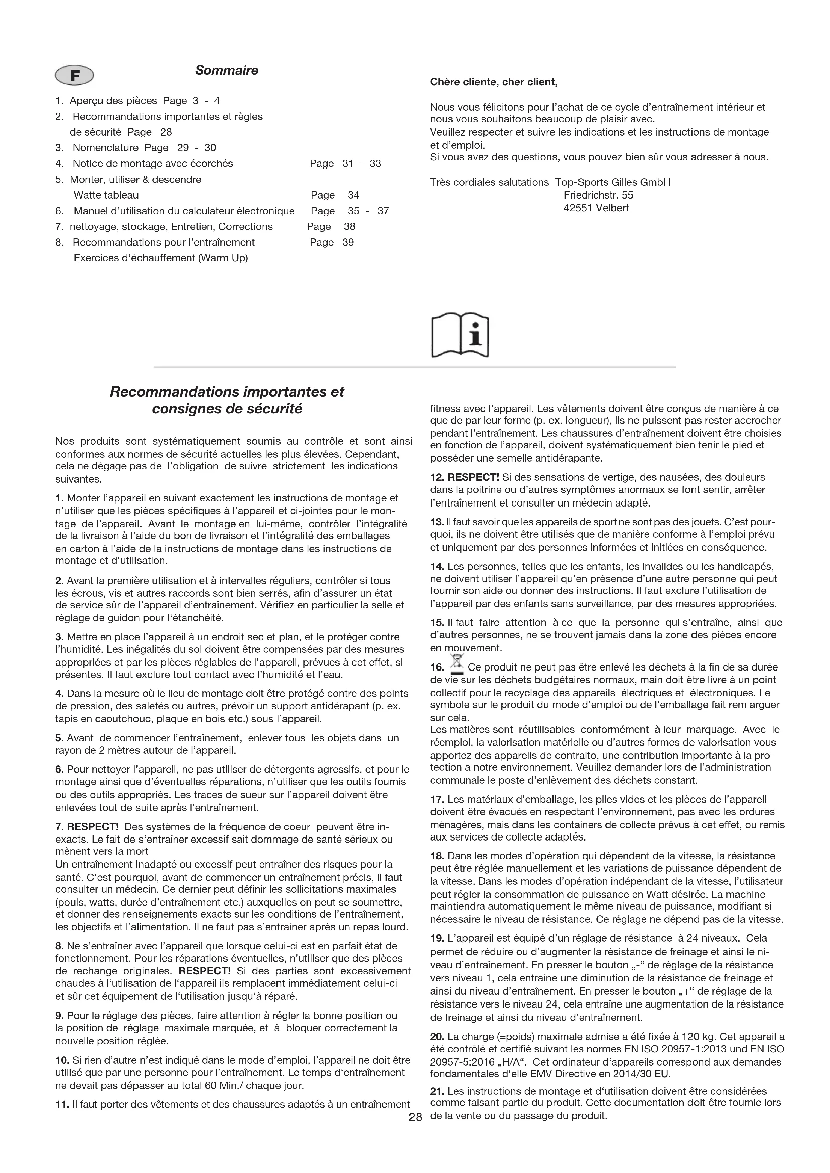 Exercices d‘échauffement (Warm Up) Chère cliente, cher client, Nous vous félicitons pour l’achat de ce cycle d’entraînement intérieur et nous vous souhaitons beaucoup de plaisir avec. Veuillez respecter et suivre les indications et les instructions de montage et d’emploi. Si vous avez des questions, vous pouvez bien sûr vous adresser à nous. Très cordiales salutations Top-Sports Gilles GmbH Friedrichstr. 55 42551 Velbert29 Français Si une pièce n’est pas correcte, s’il manque une pièce ou si vous avez besoin d’une pièce de rechange à l’avenir, veuillez vous adresser à : Top-Sports Gilles GmbH Friedrichstr. 55 42551 Velbert Telefon: +49 (0) 20 51 - 6 06 70 Telefax: +49 (0) 20 51 - 6 06 74 4 e-mail: info@christopeit-sport.com www.christopeit-sport.com Liste des pièces- Liste des pièces de rechange BT 4 N° de commande 1725 Caractéristiques techniques: Version du : 10.03.2021 Ergomètre de classe H / A avec une grande précision d‘affichage