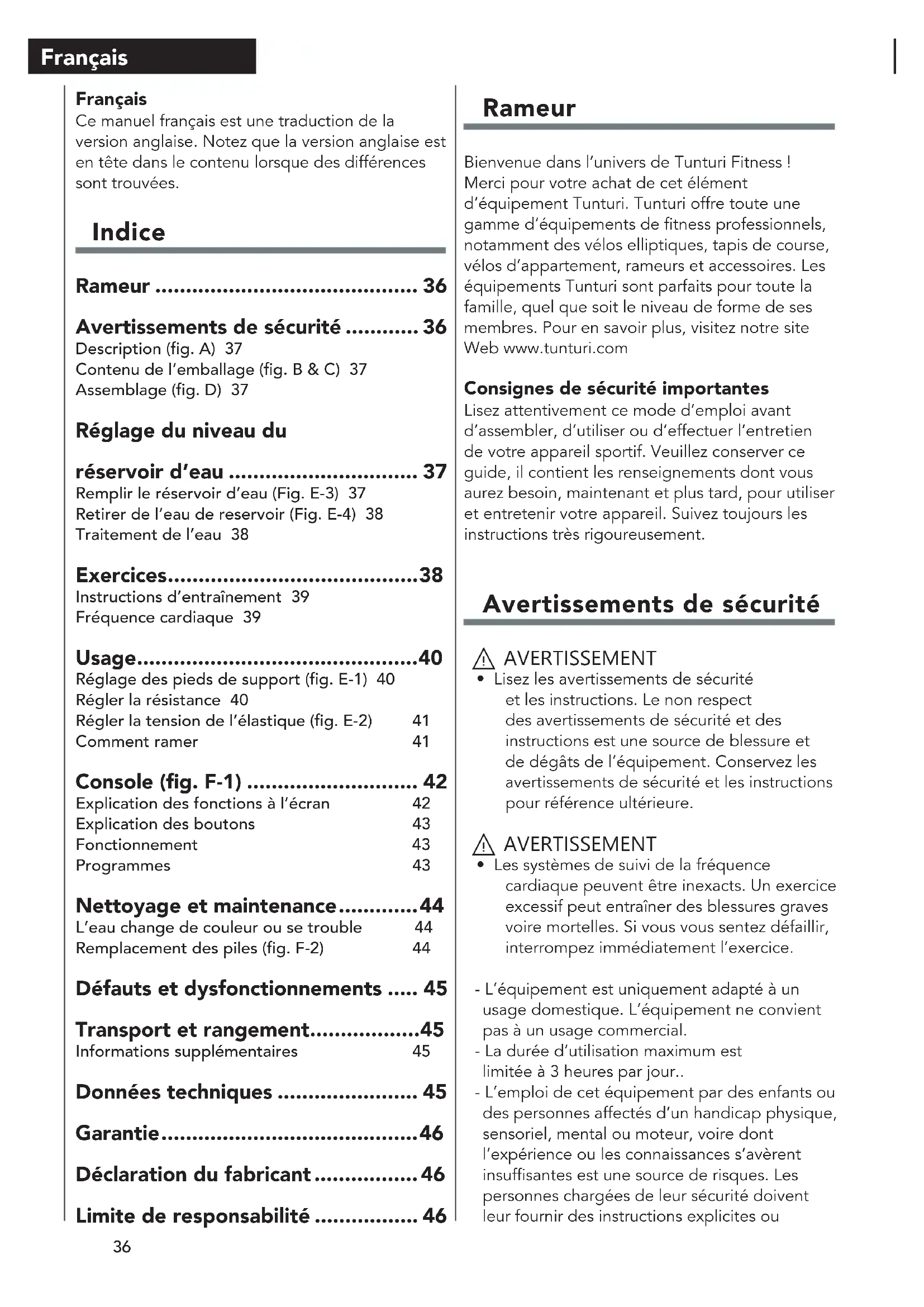 - Les systèmes de suivi de la fréquence cardiaque peuvent être inexacts. Un exercice excessif peut entraîner des blessures graves voire mortelles. Si vous vous sentez défaillir, interrompez immédiatement l’exercice. - L’équipement est uniquement adapté à un usage domestique. L’équipement ne convient pas à un usage commercial. - La durée d’utilisation maximum est limitée à 3 heures par jour.. - L’emploi de cet équipement par des enfants ou des personnes affectés d’un handicap physique, sensoriel, mental ou moteur, voire dont l’expérience ou les connaissances s’avèrent insuffisantes est une source de risques. Les personnes chargées de leur sécurité doivent leur fournir des instructions explicites ou Français Ce manuel français est une traduction de la version anglaise. Notez que la version anglaise est en tête dans le contenu lorsque des différences sont trouvées. Indice Rameur ........................................... 36 Avertissements de sécurité ............ 36 Description (g. A) 37 Contenu de l’emballage (g. B & C) 37 Assemblage (g. D) 37 Réglage du niveau du réservoir d’eau ............................... 37 Remplir le réservoir d’eau (Fig. E-3) 37 Retirer de l’eau de reservoir (Fig. E-4) 38 Traitement de l’eau 38 Exercices ......................................... 38 Instructions d’entraînement 39 Fréquence cardiaque 39 Usage .............................................. 40 Réglage des pieds de support (g. E-1) 40 Régler la résistance 40 Régler la tension de l’élastique (g. E-2) 41 Comment ramer 41 Console (g. F-1) ............................ 42 Explication des fonctions à l’écran 42 Explication des boutons 43 Fonctionnement 43 Programmes 43 Nettoyage et maintenance ............. 44 L’eau change de couleur ou se trouble 44 Remplacement des piles (g. F-2) 44 Défauts et dysfonctionnements ..... 45 Transport et rangement .................. 45 Informations supplémentaires 45 Données techniques ....................... 45 Garantie .......................................... 46 Déclaration du fabricant ................. 46 Limite de responsabilité ................. 4637 Français superviser leur usage de l’équipement. - Avant de commencer vos exercices, effectuez un bilan de santé auprès d’un médecin. - Si vous êtes pris de nausées ou de vertiges ou sentez d’autres symptômes normaux pendant l’entraînement, interrompez immédiatement la session et consultez votre médecin. - Afin d’éviter toutes douleurs et tensions musculaires, commencez vos séances par des échauffements et terminez-les par une récupération. N’oubliez pas de vous étirer après vos exercices. - L’équipement est uniquement adapté à un usage intérieur. L’équipement ne convient pas à un usage extérieur. - Utilisez l’équipement uniquement dans des environnements correctement ventilés. N’utilisez pas l’équipement dans des endroits exposés aux courants d’air afin de ne pas vous enrhumer. - Utilisez l’équipement uniquement à une température ambiante entre 10 °C et 35 °C. Rangez l’équipement uniquement à une température ambiante entre 5 °C et 45 °C. - N’utilisez et ne rangez pas l’équipement dans un environnement humide. L’humidité de l’air ne doit jamais dépasser 80 %. - Utilisez l’équipement uniquement pour son usage prévu. N’utilisez pas l’équipement pour d’autres usages que ceux décrits dans le manuel. - N’utilisez pas l’équipement si l’une de ses pièces est endommagée ou défectueuse. Si une pièce est endommagée ou défectueuse, contactez votre revendeur. - Maintenez vos mains, vos pieds et les autres parties de votre corps à l’écart des pièces mobiles. - Maintenez votre chevelure à l’écart des pièces mobiles. - Portez des vêtements et des chaussures adaptés. - Maintenez les vêtements, bijoux et autres objets à l’écart des pièces mobiles. - Assurez-vous qu’une seule personne utilise l’équipement à la fois. L’équipement e doit pas être utilisé par des personnes pesant plus de 150 kg (330 lbs). - N’ouvrez pas l’équipement sans consulter votre revendeur. Description (fig. A) Votre rameur est un élément d’équipement de fitness stationnaire servant à simuler le mouvement de ramer sans exercer de pression excessive sur les jointures. Contenu de l’emballage (fig. B & C) - L’emballage contient les pièces illustrées en fig. B. - L’emballage contient les fixations illustrées en fig. C. Voir la section “Description”. ‼ NOTE