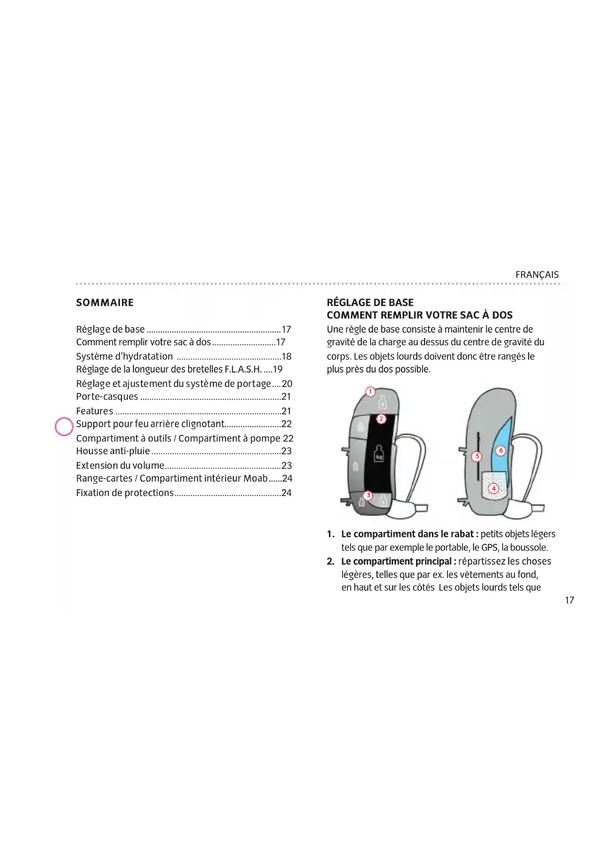 légères, telles que par ex. les vêtements au fond, en haut et sur les côtés Les objets lourds tels que18 FRANÇAIS par ex. l’équipement d’escalade (mousquetons, coinceurs, les broches à glace Express), la tente, les provisions et l’eau, doivent être placés au milieu du sac à dos et près du dos.