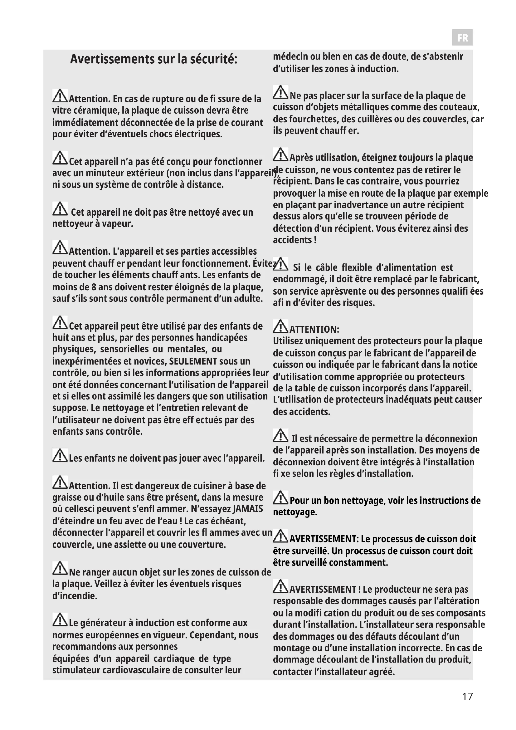 Avertissements sur la sécurité: Attention. En cas de rupture ou de fi ssure de la vitre céramique, la plaque de cuisson devra être immédiatement déconnectée de la prise de courant pour éviter d’éventuels chocs électriques. Cet appareil n’a pas été conçu pour fonctionner avec un minuteur extérieur (non inclus dans l’appareil), ni sous un système de contrôle à distance. Cet appareil ne doit pas être nettoyé avec un nettoyeur à vapeur. Attention. L’appareil et ses parties accessibles peuvent chauff er pendant leur fonctionnement. Évitez de toucher les éléments chauff ants. Les enfants de moins de 8 ans doivent rester éloignés de la plaque, sauf s’ils sont sous contrôle permanent d’un adulte. Cet appareil peut être utilisé par des enfants de huit ans et plus, par des personnes handicapées physiques, sensorielles ou mentales, ou inexpérimentées et novices, SEULEMENT sous un contrôle, ou bien si les informations appropriées leur ont été données concernant l’utilisation de l’appareil et si elles ont assimilé les dangers que son utilisation suppose. Le nettoyage et l’entretien relevant de l’utilisateur ne doivent pas être eff ectués par des enfants sans contrôle. Les enfants ne doivent pas jouer avec l’appareil. Attention. Il est dangereux de cuisiner à base de graisse ou d’huile sans être présent, dans la mesure où cellesci peuvent s’enfl ammer. N’essayez JAMAIS d’éteindre un feu avec de l’eau ! Le cas échéant, déconnecter l’appareil et couvrir les fl ammes avec un couvercle, une assiette ou une couverture. Ne ranger aucun objet sur les zones de cuisson de la plaque. Veillez à éviter les éventuels risques d’incendie. Le générateur à induction est conforme aux normes européennes en vigueur. Cependant, nous recommandons aux personnes équipées d’un appareil cardiaque de type stimulateur cardiovasculaire de consulter leur médecin ou bien en cas de doute, de s’abstenir d’utiliser les zones à induction. Ne pas placer sur la surface de la plaque de cuisson d’objets métalliques comme des couteaux, des fourchettes, des cuillères ou des couvercles, car ils peuvent chauff er. Après utilisation, éteignez toujours la plaque de cuisson, ne vous contentez pas de retirer le récipient. Dans le cas contraire, vous pourriez provoquer la mise en route de la plaque par exemple en plaçant par inadvertance un autre récipient dessus alors qu’elle se trouveen période de détection d’un récipient. Vous éviterez ainsi des accidents ! Si le câble flexible d’alimentation est endommagé, il doit être remplacé par le fabricant, son service aprèsvente ou des personnes qualifi ées afi n d’éviter des risques. ATTENTION: Utilisez uniquement des protecteurs pour la plaque de cuisson conçus par le fabricant de l’appareil de cuisson ou indiquée par le fabricant dans la notice d’utilisation comme appropriée ou protecteurs de la table de cuisson incorporés dans l‘appareil. L’utilisation de protecteurs inadéquats peut causer des accidents. Il est nécessaire de permettre la déconnexion de l’appareil après son installation. Des moyens de déconnexion doivent être intégrés à l’installation fi xe selon les règles d’installation. Pour un bon nettoyage, voir les instructions de nettoyage.