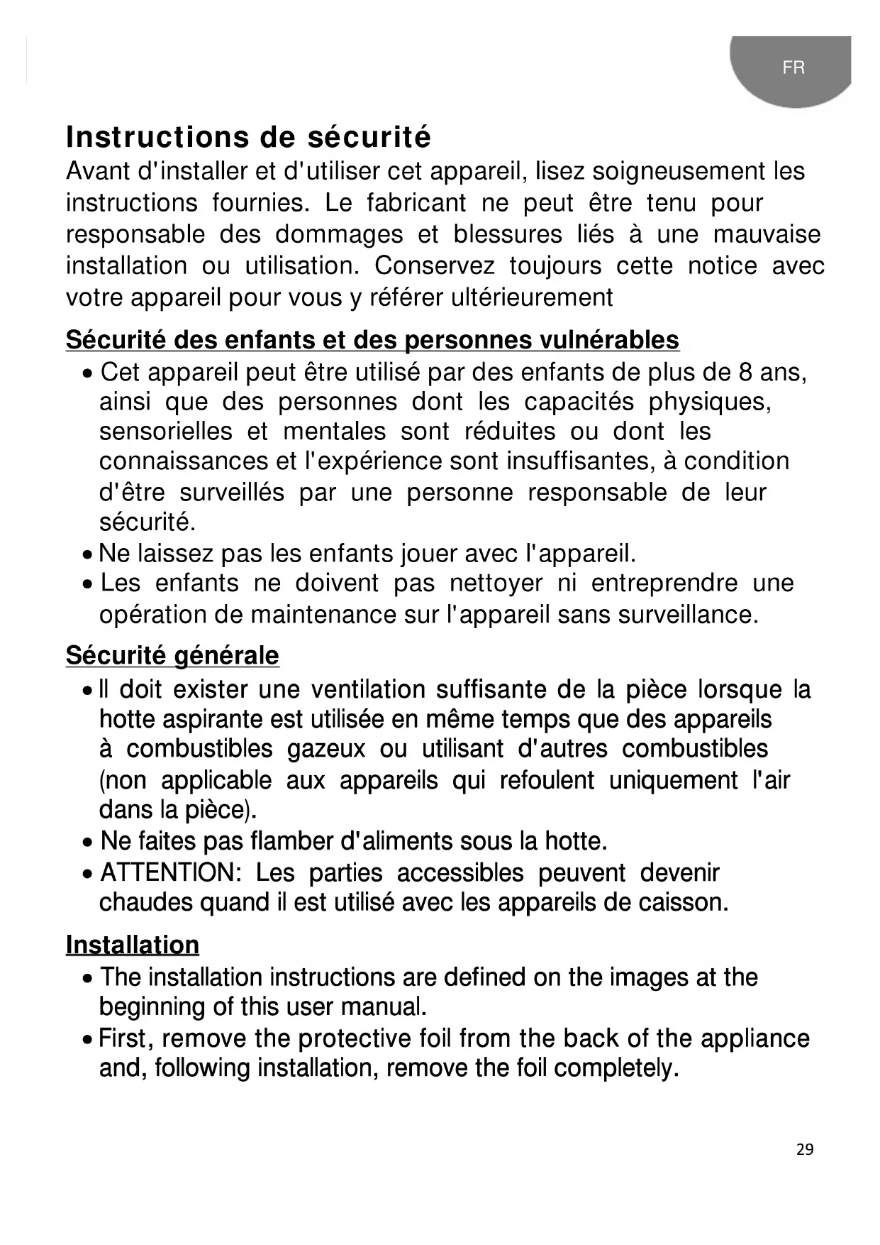Instructions de sécurité Avant d'installer et d'utiliser cet appareil, lisez soigneusement les instructions fournies. Le fabricant ne peut être tenu pour responsable des dommages et blessures liés à une mauvaise installation ou utilisation. Conservez toujours cette notice avec votre appareil pour vous y référer ultérieurement Sécurité des enfants et des personnes vulnérables