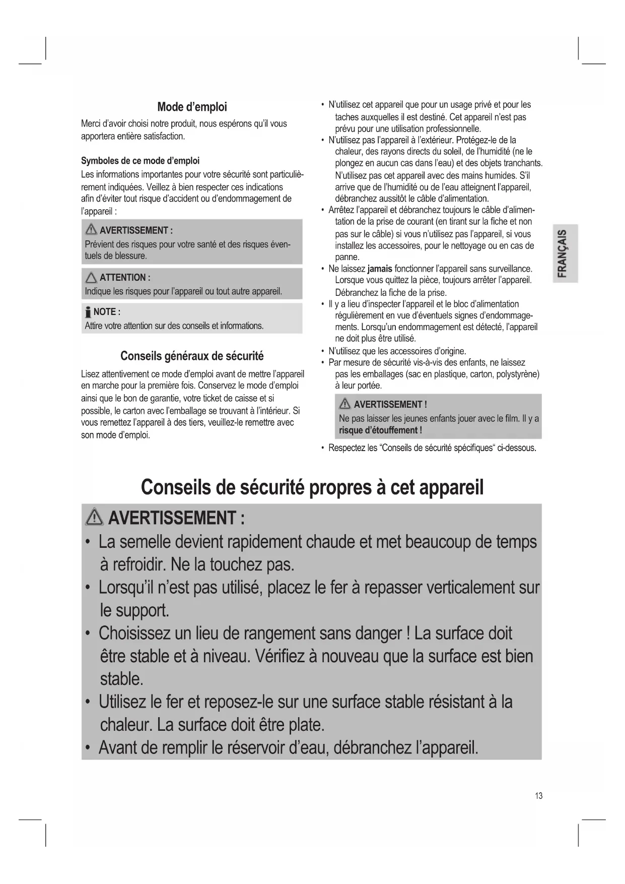Prévient des risques pour votre santé et des risques éven- tuels de blessure. ATTENTION : Indique les risques pour l’appareil ou tout autre appareil. NOTE : Attire votre attention sur des conseils et informations. Conseils généraux de sécurité Lisez attentivement ce mode d’emploi avant de mettre l’appareil en marche pour la première fois. Conservez le mode d’emploi ainsi que le bon de garantie, votre ticket de caisse et si possible, le carton avec l’emballage se trouvant à l’intérieur. Si vous remettez l’appareil à des tiers, veuillez-le remettre avec son mode d’emploi. Conseils de sécurité propres à cet appareil