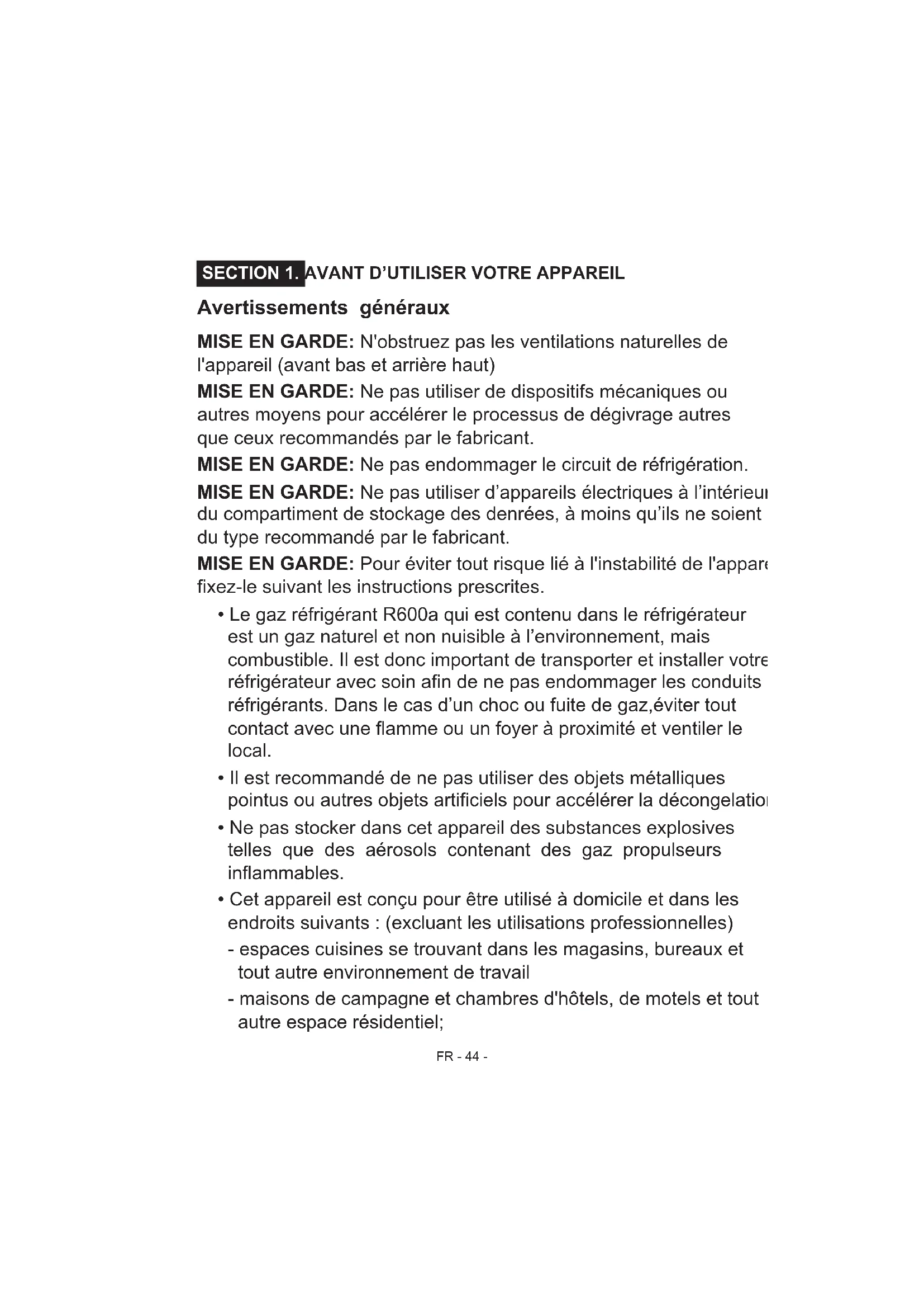 Avertissements généraux MISE EN GARDE: N'obstruez pas les ventilations naturelles de l'appareil (avant bas et arrière haut) MISE EN GARDE: Ne pas utiliser de dispositifs mécaniques ou autres moyens pour accélérer le processus de dégivrage autres que ceux recommandés par le fabricant. MISE EN GARDE: Ne pas endommager le circuit de réfrigération. MISE EN GARDE: Ne pas utiliser d’appareils électriques à l’intérieur du compartiment de stockage des denrées, à moins qu’ils ne soient du type recommandé par le fabricant. MISE EN GARDE: Pour éviter tout risque lié à l'instabilité de l'appareil, fixez-le suivant les instructions prescrites.