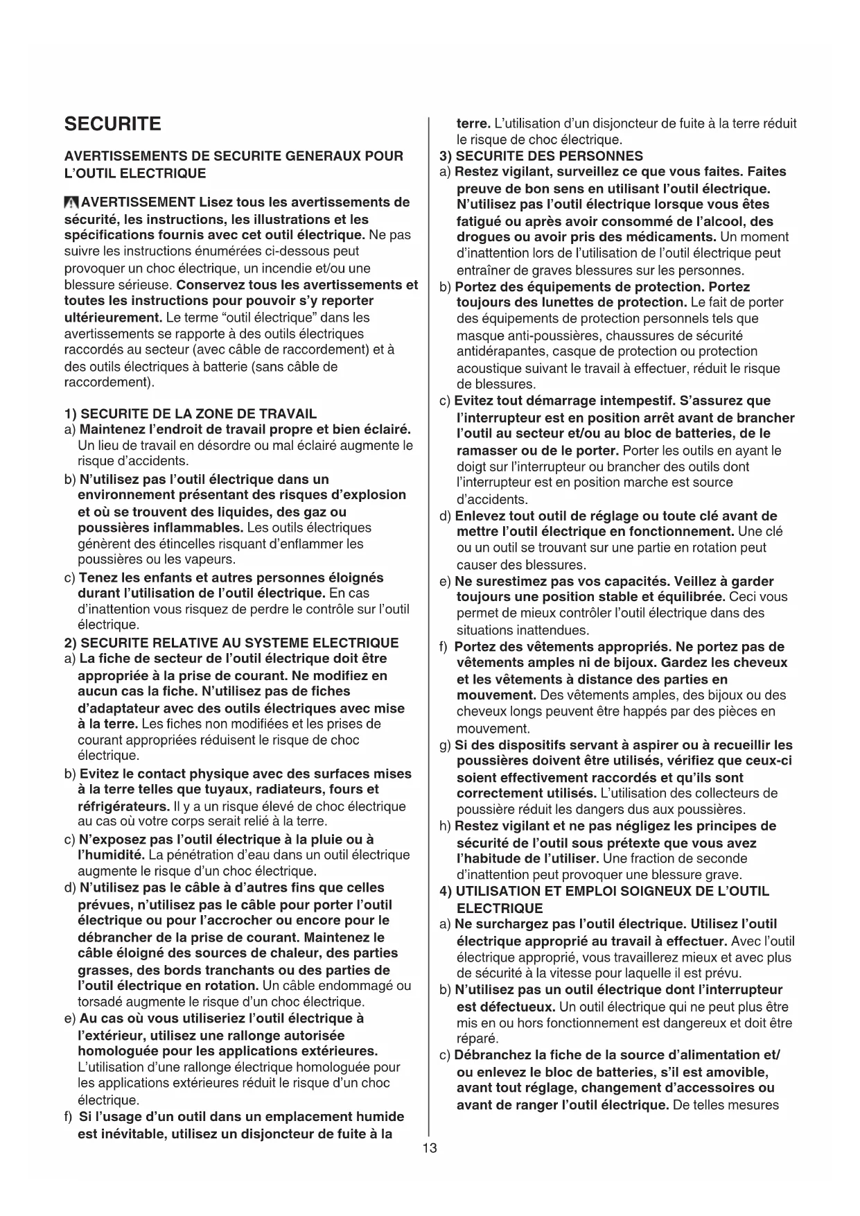 AVERTISSEMENT Lisez tous les avertissements de sécurité, les instructions, les illustrations et les specifications fournis avec cet outil electrique. Ne pas suivre les instructions enumeratedes ci-dessous peut provoquer un chic electrique, un incendie et/ou une blessure sérieuse. Conservez tous les avertissements et toutes les instructions pour pouvoir s'y reporter ultérieurement. Le terme "outil electrique" dans les avertissements se rapporte à des outils electriques raccordés au secteur (avec cable de raccordement) et à des outils electriques à batterie (sans cable de raccordement).