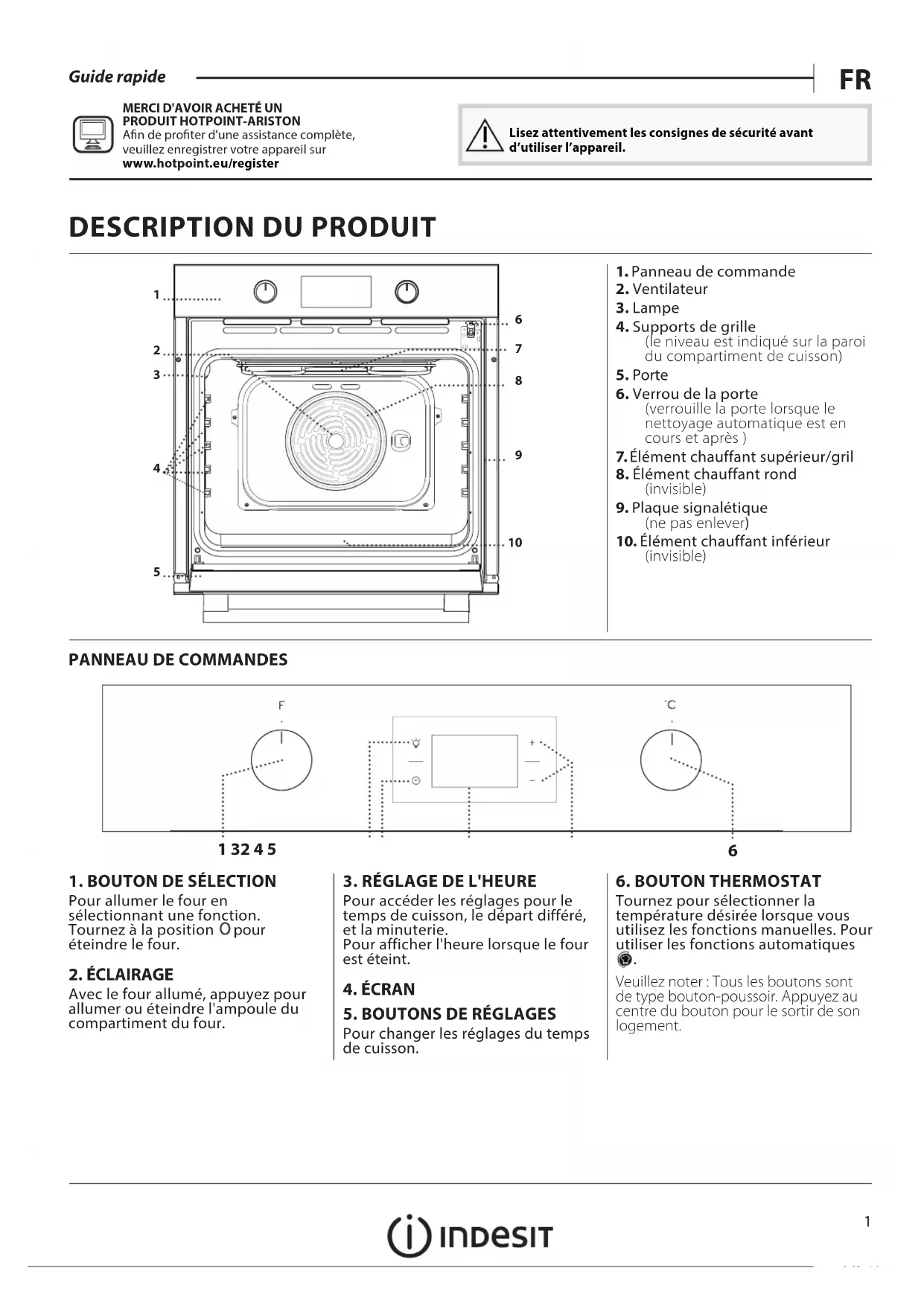 An de proter d'une assistance complète, veuillez enregistrer votre appareil sur www . hotpoint . eu/ register Lisez attentivement les consignes de sécurité avant d’utiliser l’appareil.2 CONVECTION NATURELLE Pour cuire tout type de plat sur une seule grille. MULTI-NIVEAU Pour cuire différents aliments demandant la même température de cuisson sur plusieurs grilles (maximum de trois) en même temps. Cette fonction permet de cuire différents aliments sans transmettre les odeurs d'un aliment à l'autre. XL COOKING Pour cuire de gros morceaux de viande (supérieurs à 2,5kg). Nous vous conseillons de retourner la viande durant la cuisson pour s'assurer que les deux côtés brunissent de façon égale. Nous vous conseillons d'arroser le rôti de temps en temps pour éviter qu'il ne s'assèche. PIZZA Pour cuire différents types et tailles de pain et de pizza. Nous vous conseillons d'échanger la position des plaques de cuisson à la mi-cuisson. GRILL Pour cuire des biftecks, des brochettes, et des saucisses, faire gratiner des légumes et griller du pain. Pour la cuisson de la viande, nous vous conseillons d'utiliser une plaque de cuisson pour recueillir les jus de cuisson : Placez la lèchefrite, contenant 200 ml d'eau, sur n'importe quel niveau sous la grille métallique. GRATIN Pour griller de gros morceaux de viande (gigots, rôtis, poulets). Nous vous conseillons d'utiliser une lèchefrite pour recueillir les jus de cuisson : Placez la lèchefrite, contenant 200 ml d'eau, sur n'importe quel niveau sous la grille métallique. ACCESSOIRES Pour plus d'information, téléchargez le Guide d'utilisation et d'entretien à partir de docs.indesit.eu WWW