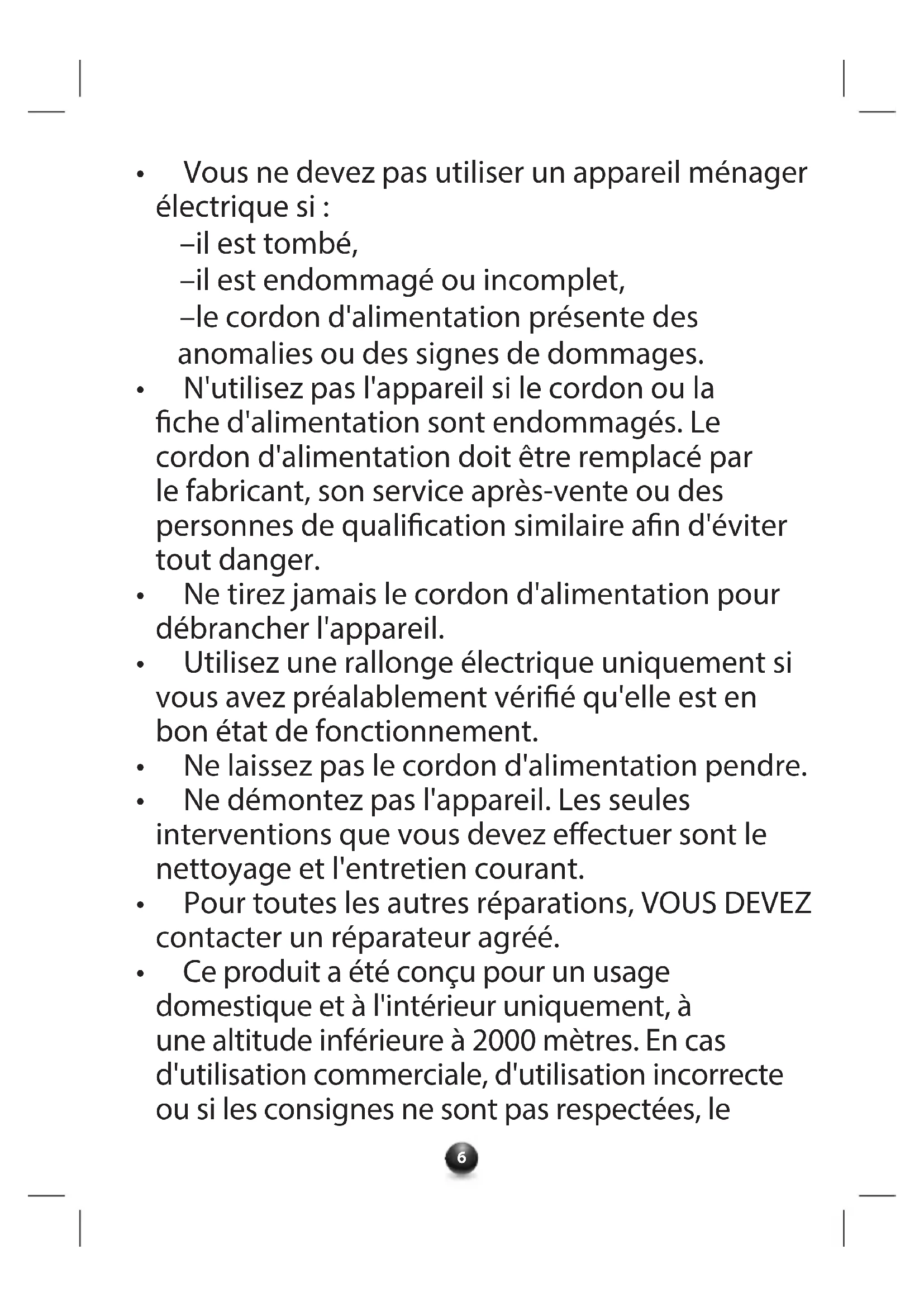 - Vousnedevezpasutiliserunappareilménager électriquesi: – ilesttombé, – ilestendommagéouincomplet, – lecordond'alimentationprésentedes anomaliesoudessignesdedommages.