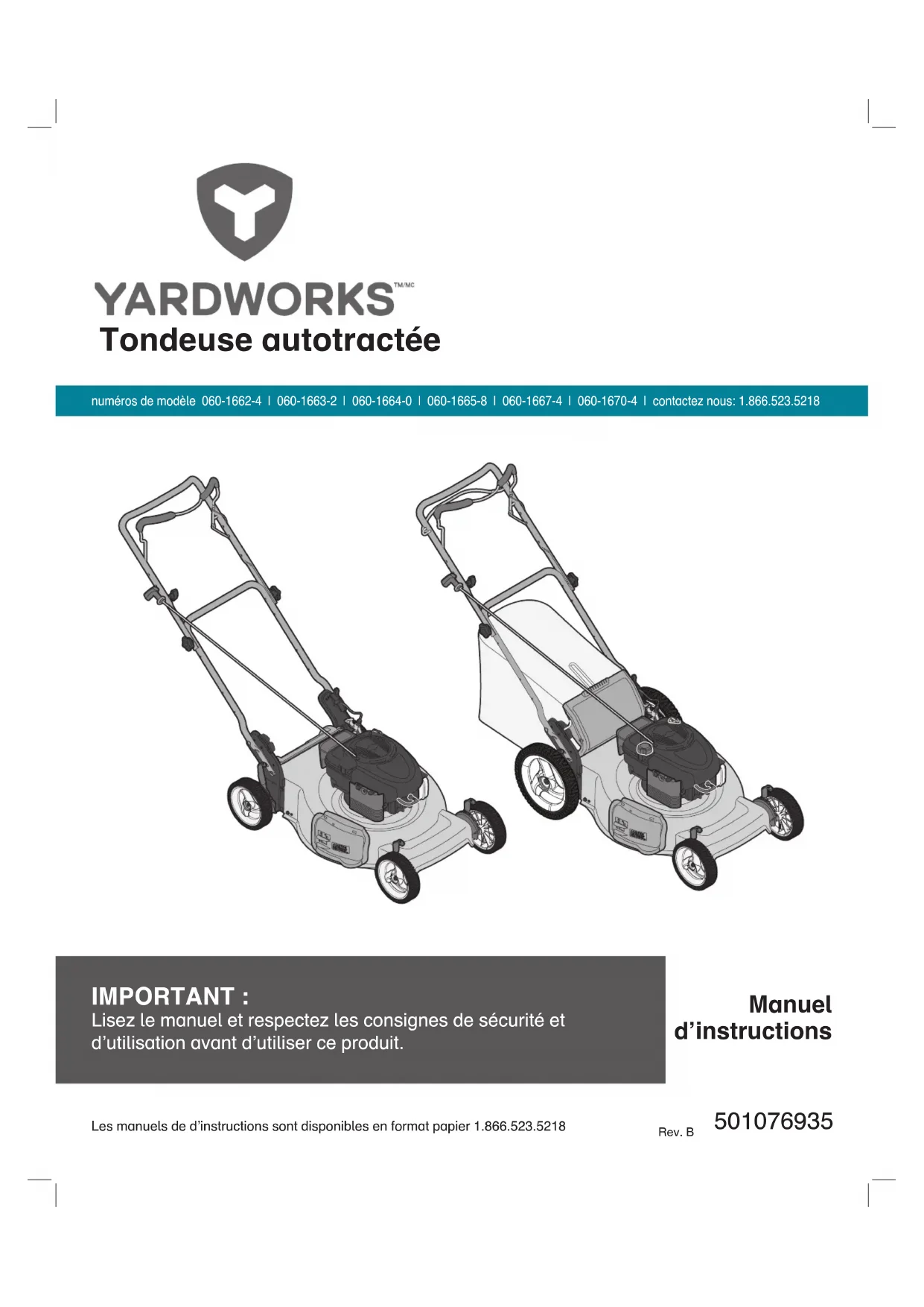 - (le cas échéant) ** Tondeuses avec démarreur électrique *** Tondeuses à gazon autopropulsées **** Utiliser un racloir pour nettoyer sous le carter REMARQUES : (1) Vidangez l’huile plus souvent lorsque le moteur fonctionne sous une charge lourde ou à des températures ambiantes élevées. (2) Effectuez l’entretien plus souvent dans le cas d’une utilisation dans un environnement sale ou poussiéreux. (3) Remplacez les lames plus souvent lorsque vous tondez sur un sol sableux. (4) Chargez pendant 48 heures à la n de la saison. (5) Et après toutes les 5 heures d’utilisation. Entretien numéros de modèle 060-1662-4 | 060-1663-2 | 060-1664-0 | 060-1665-8 | 060-1667-4 | 060-1670-4 | contactez nous: 1.866.523.5218 numéros de modèle 060-1662-4 | 060-1663-2 | 060-1664-0 | 060-1665-8 | 060-1667-4 | 060-1670-4 | contactez nous: 1.866.523.52181.866.523.5218 Fabriqué aux États-Unis Yardworks Canada Toronto, Canada M4S 2B8