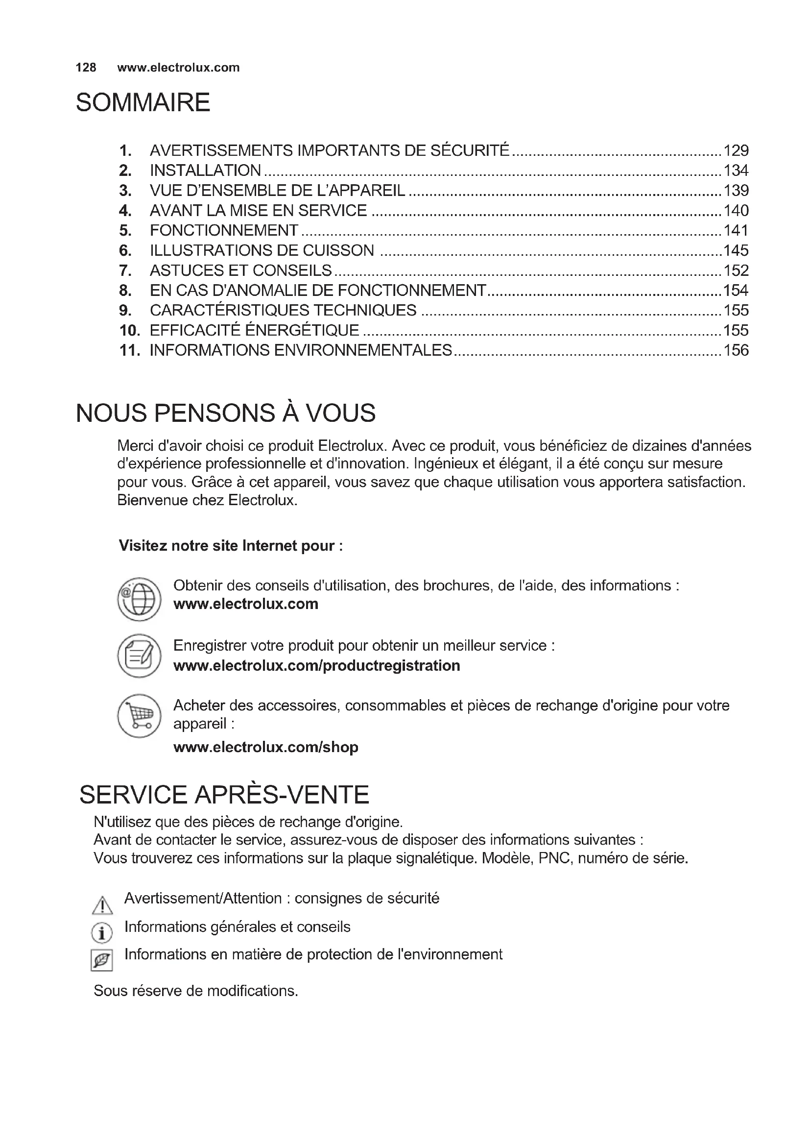 N'utilisez que des pièces de rechange d'origine. Avant de contacter le service, assurez-vous de disposer des informations suivantes : Vous trouverez ces informations sur la plaque signalétique. Modèle, PNC, numéro de série. Sous réserve de modications. Avertissement/Attention : consignes de sécurité Informations générales et conseils Informations en matière de protection de l'environnement Obtenir des conseils d'utilisation, des brochures, de l'aide, des informations : www.electrolux.com Enregistrer votre produit pour obtenir un meilleur service : www.electrolux.com/productregistration Acheter des accessoires, consommables et pièces de rechange d'origine pour votre appareil : www.electrolux.com/shop