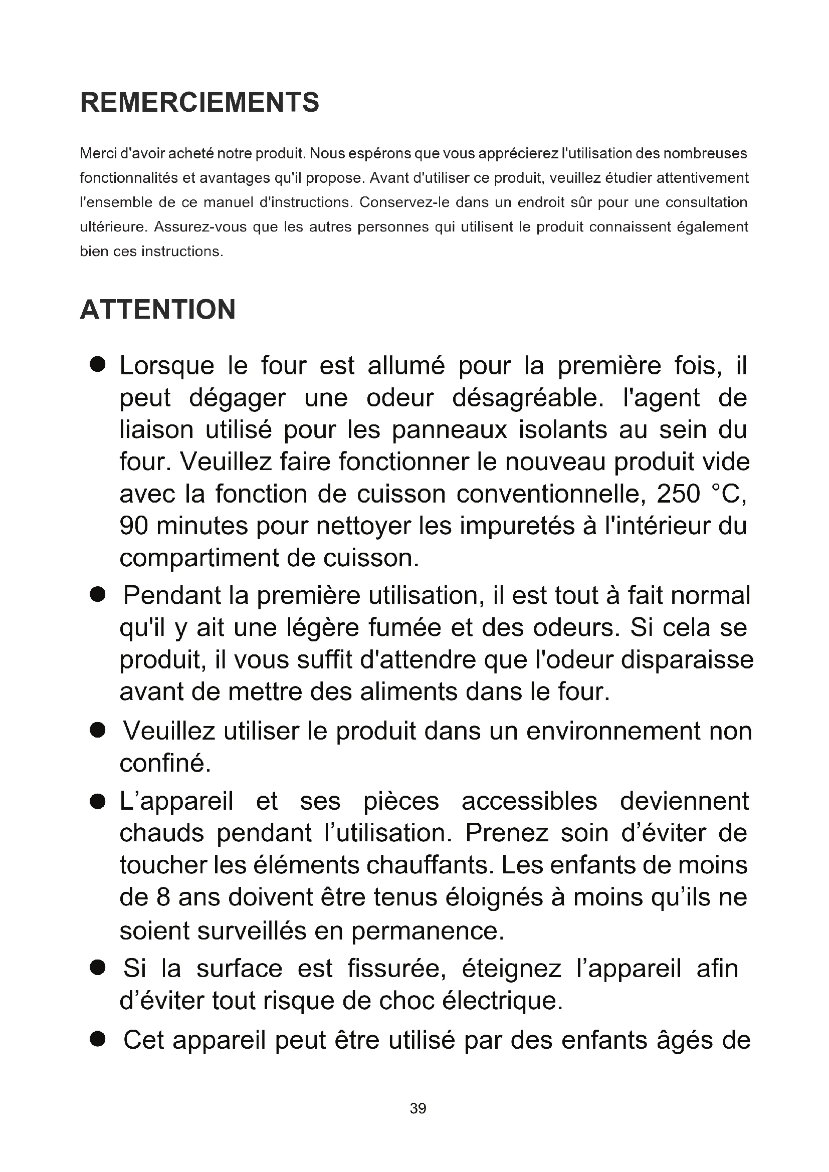 Lorsque le four est allumé pour la première fois, il peut dégager une odeur désagréable. l'agent de liaison utilisé pour les panneaux isolants au sein du four. Veuillez faire fonctionner le nouveau produit vide avec la fonction de cuisson conventionnelle, 250 °C, 90 minutes pour nettoyer les impuretés à l'intérieur du compartiment de cuisson. Pendant la première utilisation, il est tout à fait normal qu'il y ait une légère fumée et des odeurs. Si cela se produit, il vous suft d'attendre que l'odeur disparaisse avant de mettre des aliments dans le four. Veuillez utiliser le produit dans un environnement non conné.