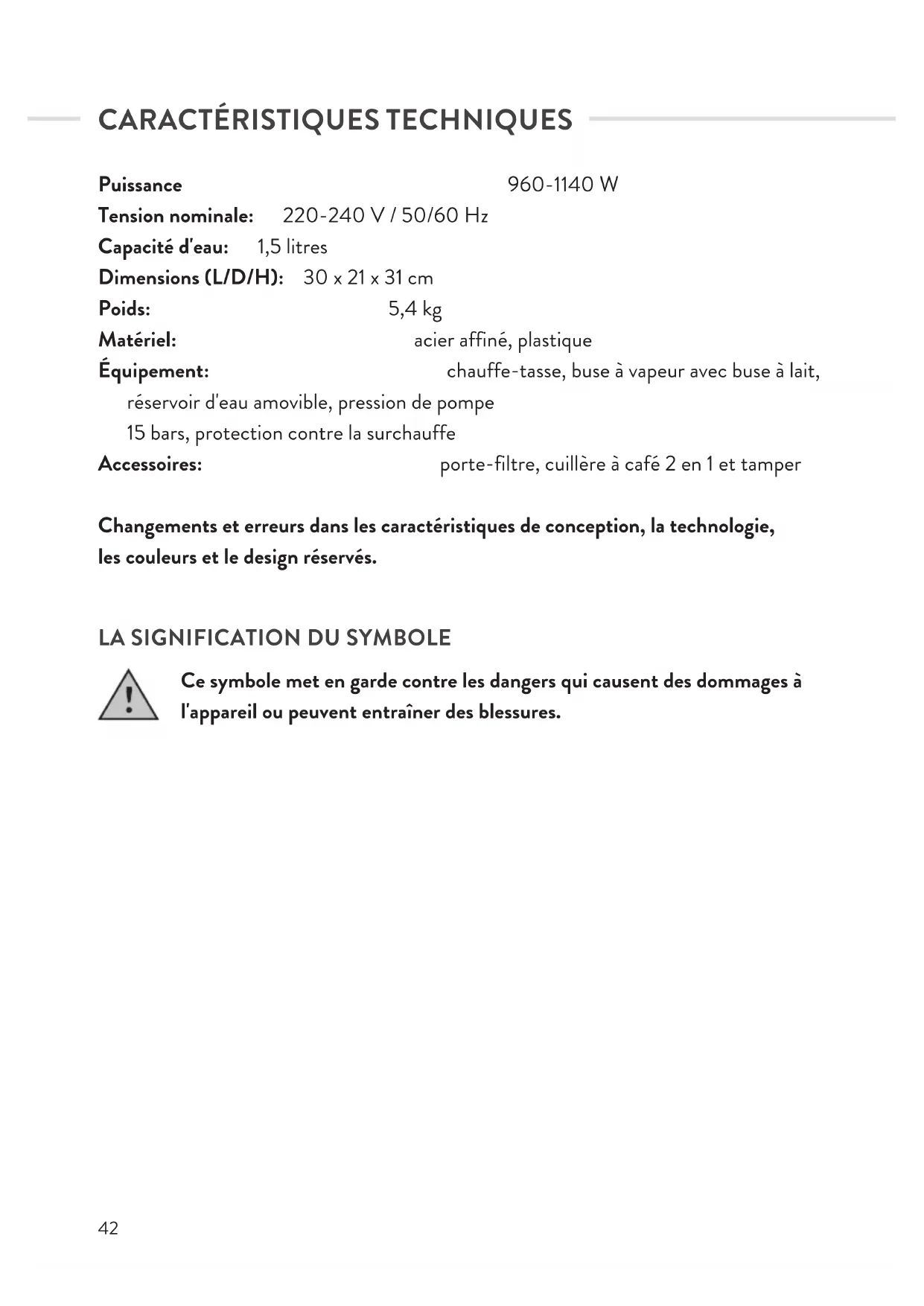 Équipement: chauffe-tasse, buse à vapeur avec buse à lait, réservoir d'eau amovible, pression de pompe 15 bars, protection contre la surchauffe
