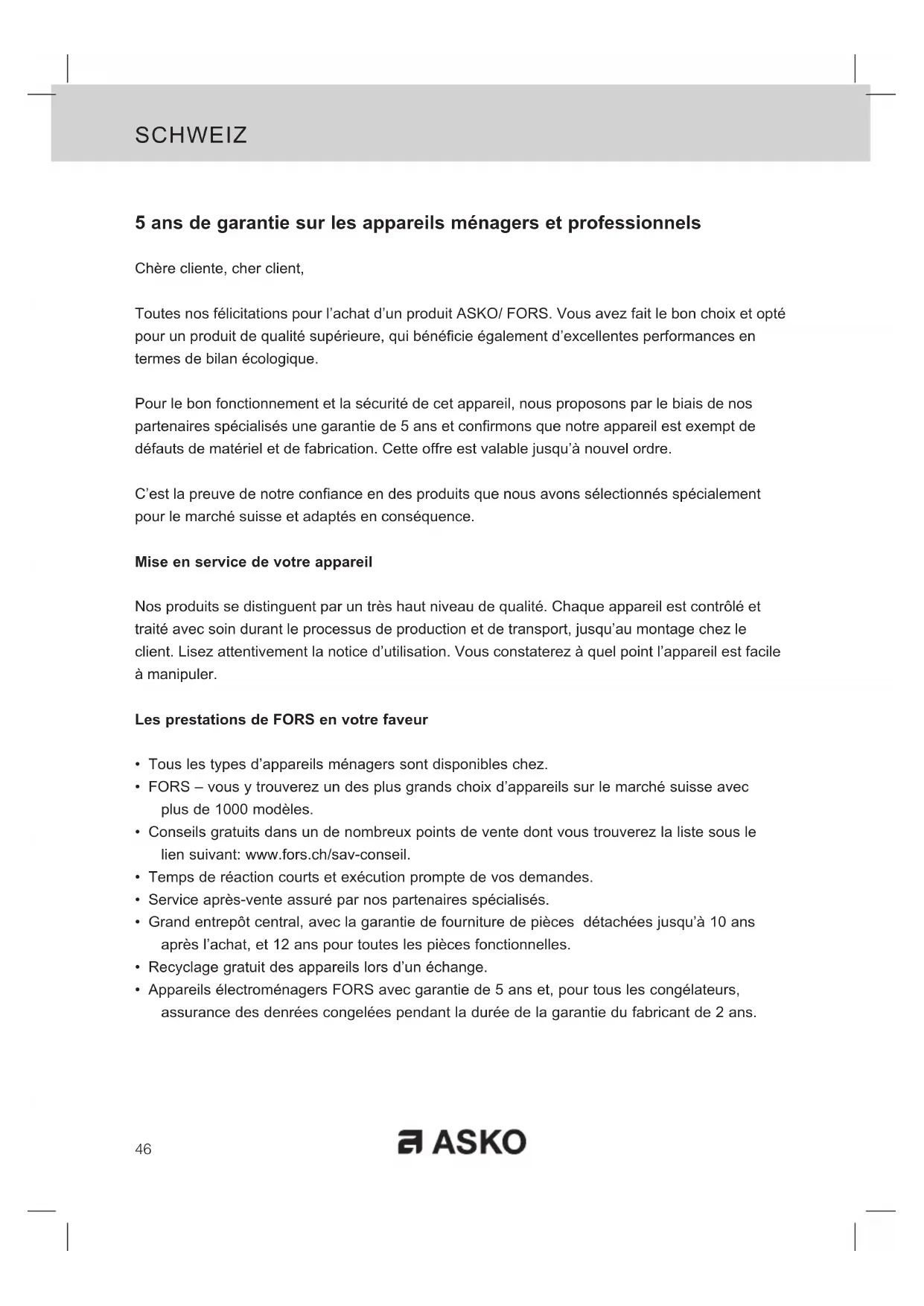 - Die aktuellen Konditionen erhalten Sie über www.fors.ch/service-beratung.46 SCHWEIZ 5 ans de garantie sur les appareils ménagers et professionnels Chère cliente, cher client, Toutes nos félicitations pour l’achat d’un produit ASKO/ FORS. Vous avez fait le bon choix et opté pour un produit de qualité supérieure, qui bénéficie également d’excellentes performances en termes de bilan écologique. Pour le bon fonctionnement et la sécurité de cet appareil, nous proposons par le biais de nos partenaires spécialisés une garantie de 5 ans et confirmons que notre appareil est exempt de défauts de matériel et de fabrication. Cette offre est valable jusqu’à nouvel ordre. C’est la preuve de notre confiance en des produits que nous avons sélectionnés spécialement pour le marché suisse et adaptés en conséquence. Mise en service de votre appareil Nos produits se distinguent par un très haut niveau de qualité. Chaque appareil est contrôlé et traité avec soin durant le processus de production et de transport, jusqu’au montage chez le client. Lisez attentivement la notice d’utilisation. Vous constaterez à quel point l’appareil est facile à manipuler. Les prestations de FORS en votre faveur