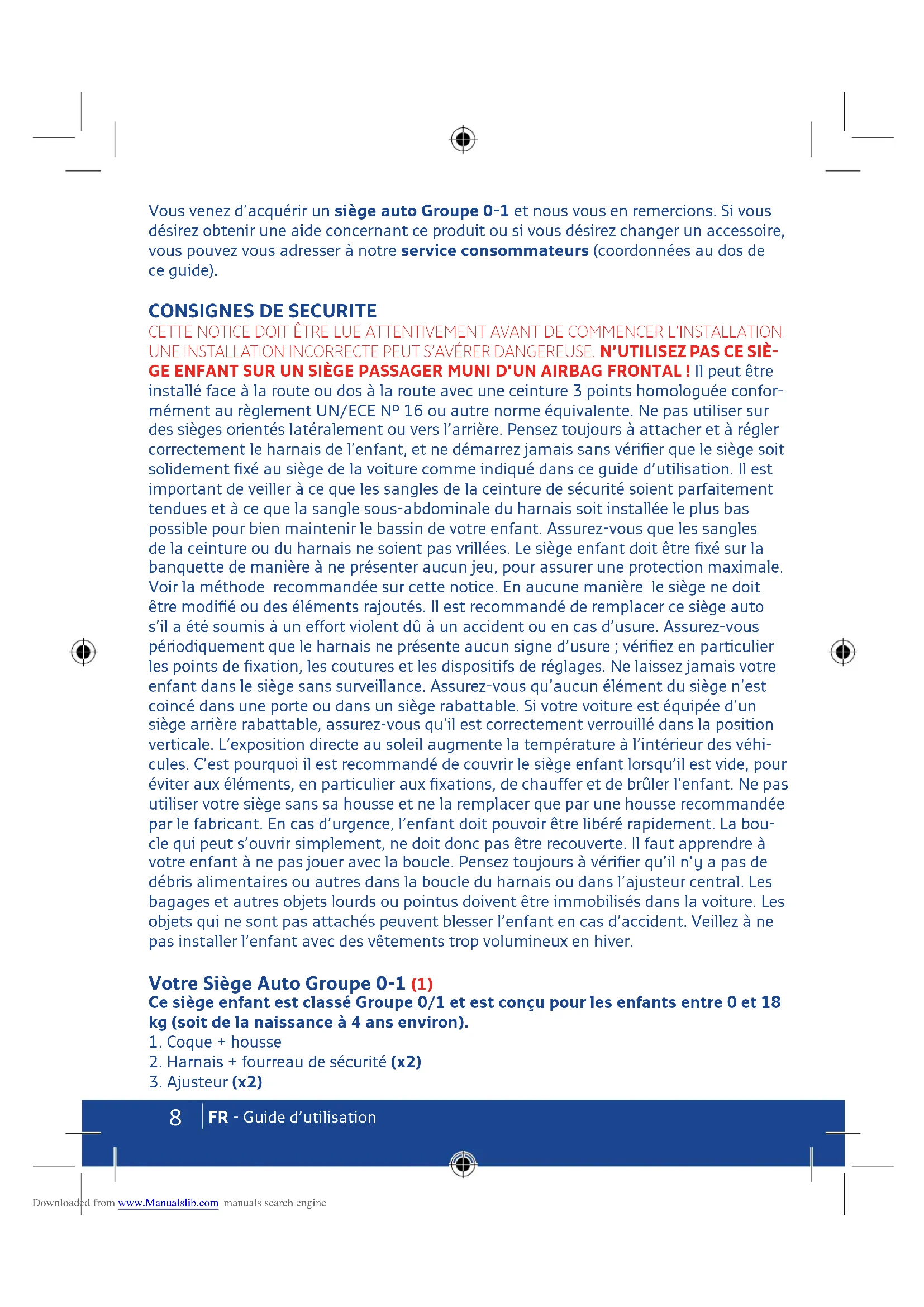 Downloaded from www.Manualslib.com manuals search engine8 FR - Guide d’utilisation Vous venez d’acquérir un siège auto Groupe 0-1 et nous vous en remercions. Si vous désirez obtenir une aide concernant ce produit ou si vous désirez changer un accessoire, vous pouvez vous adresser à notre service consommateurs (coordonnées au dos de ce guide).