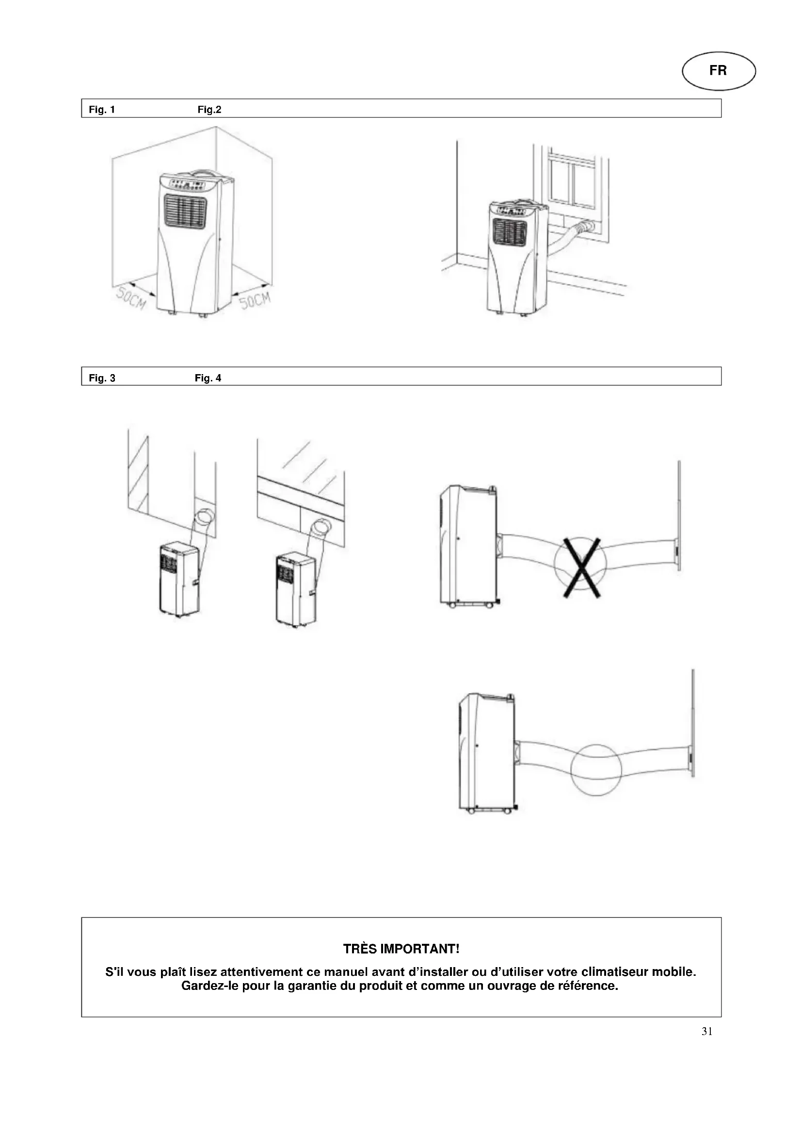 L'appareil peut être déplacé sans aucun soucis, d'une pièce à l'autre, cependant veuillez respecter quelques consignes : installation du tuyau de sortie d'air, fig. 2 et 3