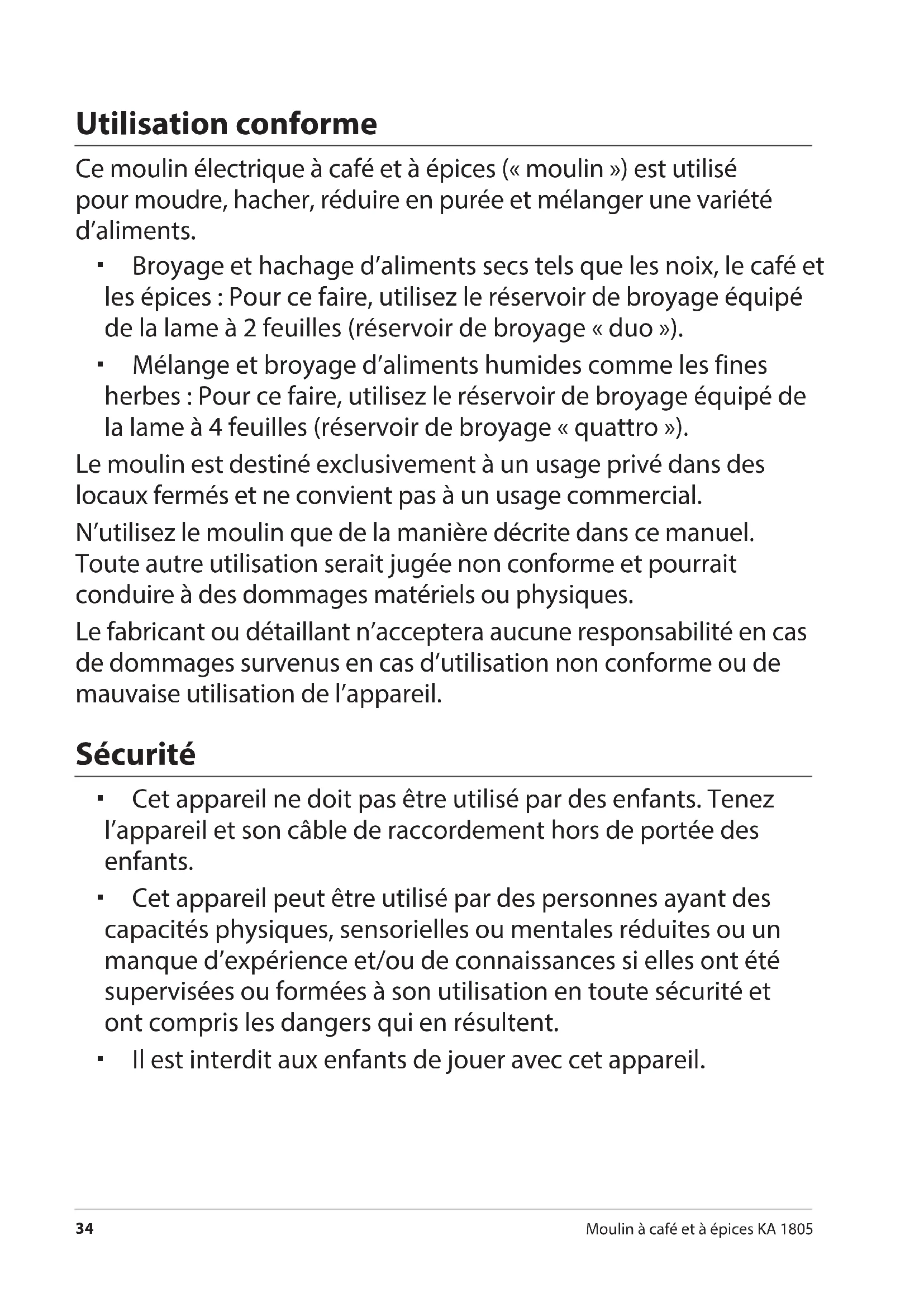 N'utilisez le moulin que de la manière décrite dans ce manuel. Toute autre utilisation serait jugée non conforme et pourrait conduire à des dommages matériels ou physiques.