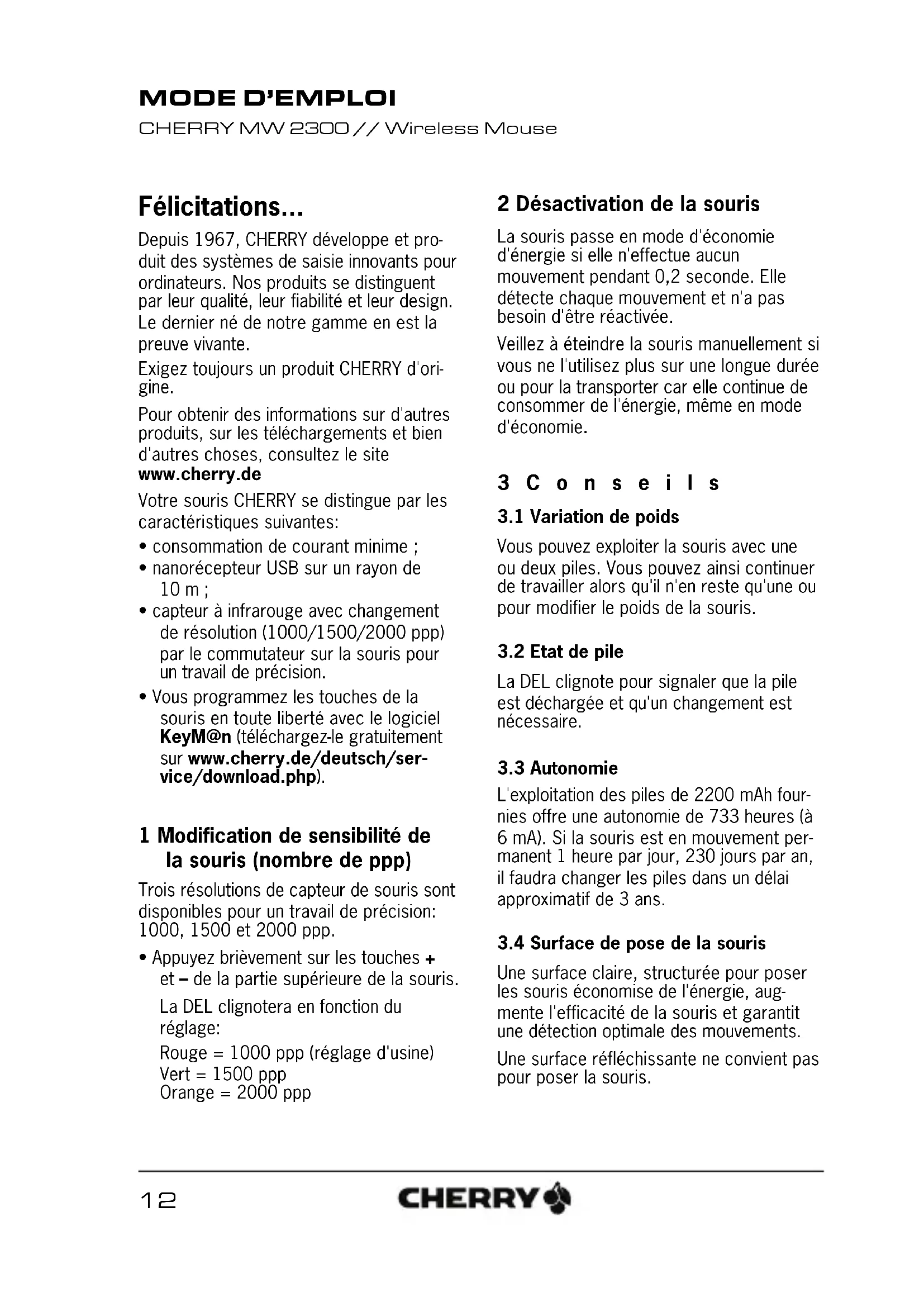 CHERRY MW 2300 // Wireless Mouse15 7 Généralités CHERRY, une marque de ZF Friedrichsha- fen AG, optimise continuellement ses pro- duits en fonction des progrès technologiques. Par conséquent, nous nous réservons le droit de faire des modifi- cations techniques. L'évaluation de la fiabi- lité ainsi que la définition des détails techniques sont le résultat des tests inter- nes conformes aux normes internationales en vigueur. D'autres spécifications peu- vent être appliquées suite à une coopéra- tion mutuelle. Des mauvaises conditions d'utilisation, de stockage, ou d'environne- ment peuvent entraîner des dysfonctionne- ments ou des dommages lors de l'utilisation. Nous insistons sur le fait que nous ne pou- vons accorder quelque garantie que ce soit causée par une modification du matériel par l'utilisateur. Tous les travaux de répara- tion doivent être réalisés par nos soins ou une personne/organisation officiellement agréée. Toute demande d'indemnisation éventuelle contre ZF Friedrichshafen AG ou ses repré- sentants – quoi que soit la cause (ainsi que des dommages corporels dus a une réac- tion émotionnelle) – sera rejetée dans la mesure où elle n'est pas la conséquence d'une négligence de notre part. Les restric- tions ci-dessus ne s'appliquent pas dans le cadre de la loi sur la Responsabilité Pro- duit allemande ainsi qu'en cas de blessu- res corporelles ou d'atteintes à la santé. Les conditions d'utilisation ci-dessus ne sont valables que pour le produit livré avec cette notice. Pour tout complément d'information, veuillez contacter les distributeurs corres- pondants ou nos services. 8Garantie La garantie légale s'applique. Veuillez con- tacter votre revendeur ou votre partenaire contractuel. Pour tout complément d'infor- mation concernant la garantie, veuillez con- sulter notre site www.cherry.de 9 Déclaration de conformité CE Par la présente ZF Friedrichsha- fen AG , Division Electronic Sys- tems, Auerbach/Opf., Allemagne, déclare que ce dis- positif radiofréquence est conforme aux exigences essentielles et aux autres dispo- sitions pertinentes de la directive 1999/5/CE. La déclaration de conformité à la norme CE est disponible à partir de l'URL: www.cherry.de/compliance Une fois sur la page, cliquez sur le nom du produit qui vous intéresse pour y accéder.16 ¡Felicidades! Desde 1967 CHERRY viene desarrollando y produciendo innovadores sistemas de introducción de datos para ordenadores. Su nuevo teclado le hará notar la diferen- cia en calidad, fiabilidad y diseño. Exija siempre un CHERRY original. En la dirección www.cherry.de podrá, entre otros, encontrar y descargar informa- ción sobre los productos. El ratón CHERRY se distingue principal- mente por las siguientes características: