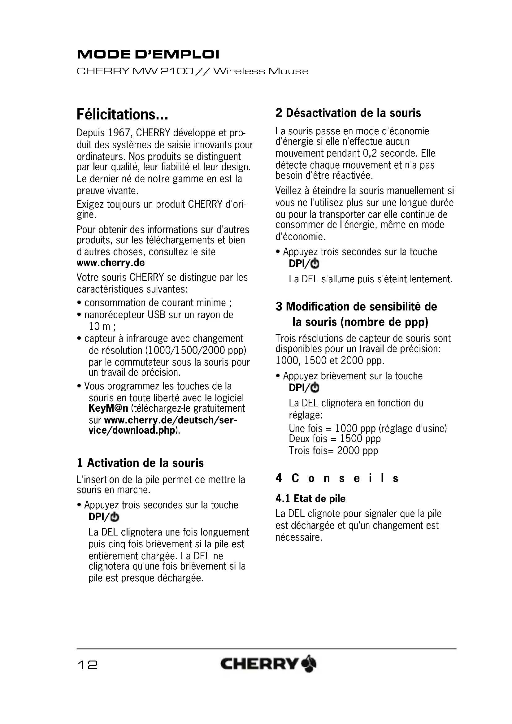 For use with Listed Personal Computers only!12 Félicitations... Depuis 1967, CHERRY développe et pro- duit des systèmes de saisie innovants pour ordinateurs. Nos produits se distinguent par leur qualité, leur fiabilité et leur design. Le dernier né de notre gamme en est la preuve vivante. Exigez toujours un produit CHERRY d'ori- gine. Pour obtenir des informations sur d'autres produits, sur les téléchargements et bien d'autres choses, consultez le site www.cherry.de Votre souris CHERRY se distingue par les caractéristiques suivantes: