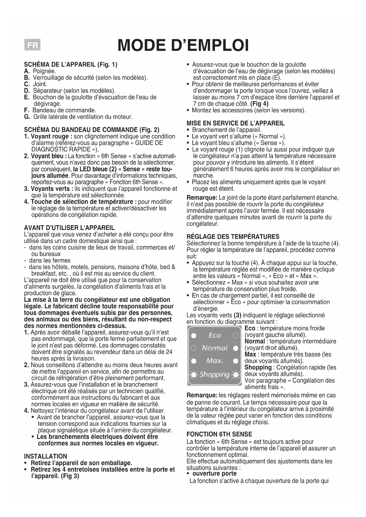 Levoyantbleusallume(«Sense»). - Levoyant rouge (1) clignote lui aussi pour indiquer que le congélateur n'a pas atteint la température nécessaire pour pouvoir y introduire les alimentés. Il s'esteient generally 6 heures après avoir mis le congélateur en marche.
