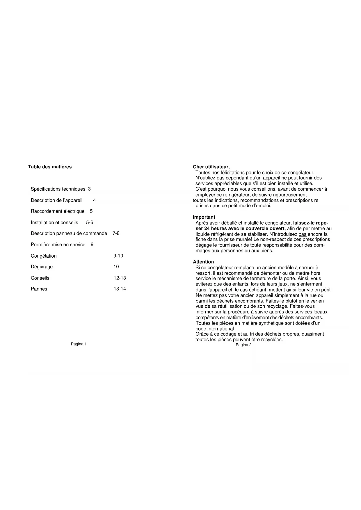 Spécifications techniques 3 Description de l’appareil 4 Raccordement électrique 5 Installation et conseils 5-6 Description panneau de commande 7-8 Première mise en service 9 Congélation 9-10 Dégivrage 10 Conseils 12-13 Pannes 13-14
