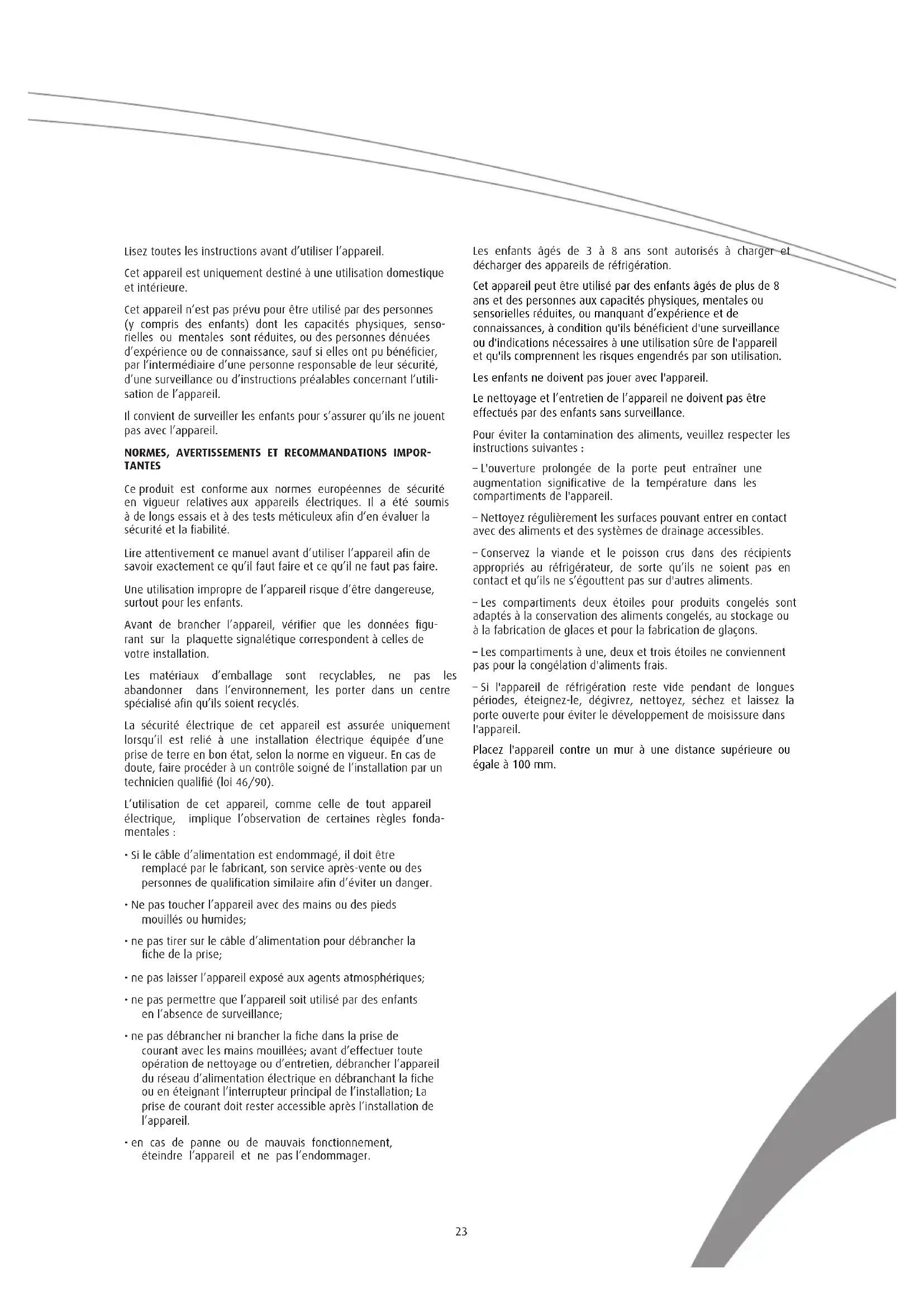 - en cas de panne ou de mauvais fonctionnement, éteindre l’appareil et ne pas l’endommager. Les enfants âgés de 3 à 8 ans sont autorisés à charger et décharger des appareils de réfrigération. Cet appareil peut être utilisé par des enfants âgés de plus de 8 ans et des personnes aux capacités physiques, mentales ou sensorielles réduites, ou manquant d’expérience et de connaissances, à condition qu'ils bénéficient d'une surveillance ou d'indications nécessaires à une utilisation sûre de l'appareil et qu'ils comprennent les risques engendrés par son utilisation. Les enfants ne doivent pas jouer avec l'appareil. Le nettoyage et l’entretien de l’appareil ne doivent pas être effectués par des enfants sans surveillance. Pour éviter la contamination des aliments, veuillez respecter les instructions suivantes : – L'ouverture prolongée de la porte peut entraîner une augmentation significative de la température dans les compartiments de l'appareil. – Nettoyez régulièrement les surfaces pouvant entrer en contact avec des aliments et des systèmes de drainage accessibles. – Conservez la viande et le poisson crus dans des récipients appropriés au réfrigérateur, de sorte qu’ils ne soient pas en contact et qu’ils ne s’égouttent pas sur d'autres aliments. – Les compartiments deux étoiles pour produits congelés sont adaptés à la conservation des aliments congelés, au stockage ou à la fabrication de glaces et pour la fabrication de glaçons. – Les compartiments à une, deux et trois étoiles ne conviennent pas pour la congélation d'aliments frais. – Si l'appareil de réfrigération reste vide pendant de longues périodes, éteignez-le, dégivrez, nettoyez, séchez et laissez la porte ouverte pour éviter le développement de moisissure dans l'appareil. Placez l'appareil contre un mur à une distance supérieure ou égale à 100 mm.