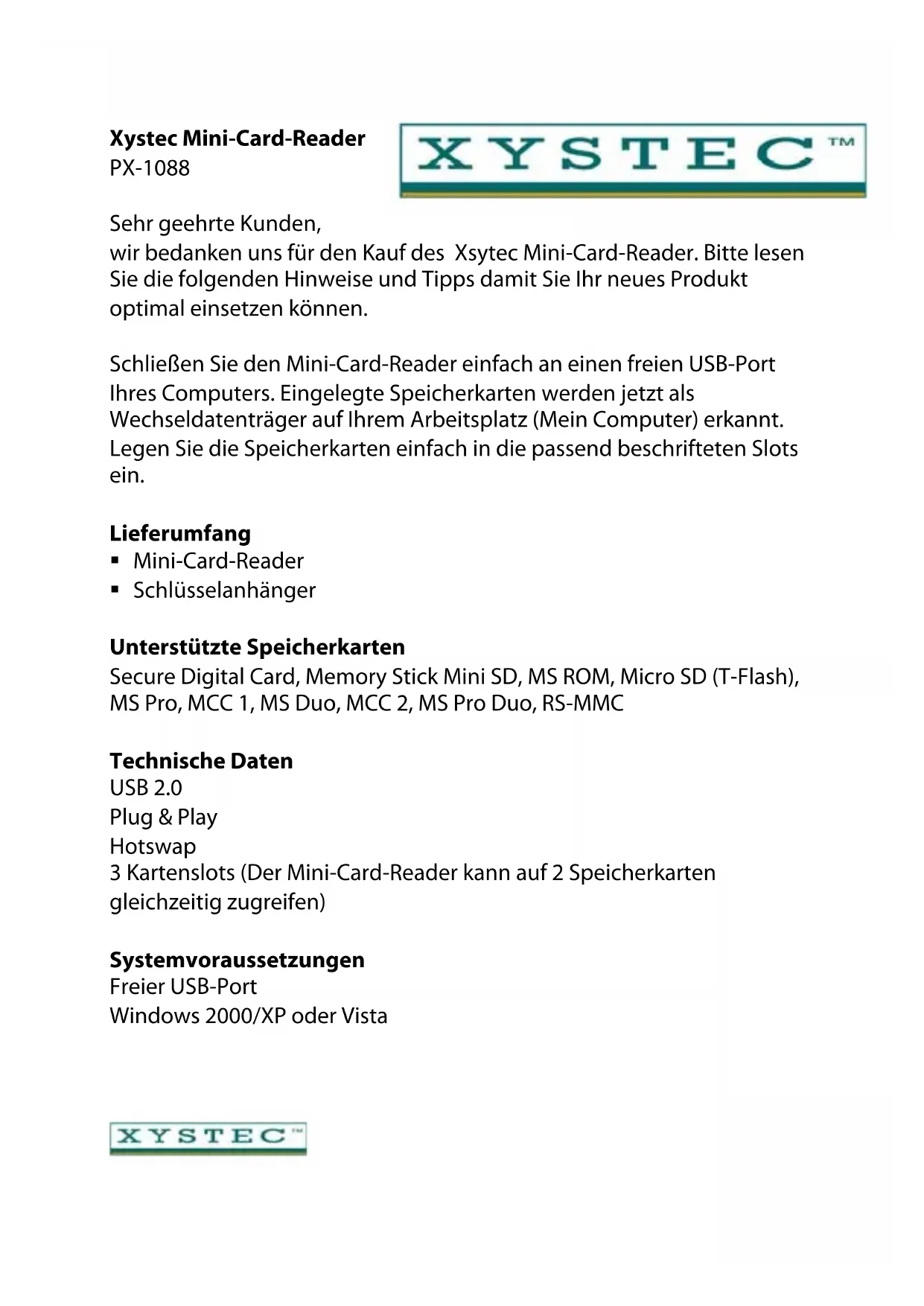 Wichtige Hinweise zur Entsorgung Dieses Elektrogerät gehört NICHT in den Hausmüll. Für die fachgerechte Entsorgung wenden Sie sich bitte an die öffentlichen Sammelstellen in Ihrer Gemeinde. © 10/2008 – CE//VGMini lecteur de cartes Xsytec PX-1088 Chère cliente, Cher client, Nous vous remercions pour l’achat de ce Mini lecteur de cartes Xsytec. Branchez simplement le lecteur sur un port USB libre de votre ordinateur. Les cartes mémoires insérées sont alors reconnues. Insérez simplement les cartes mémoires dans les fentes correspondantes. Contenu Mini lecteur de cartes Porte-clé Cartes mémoire compatibles Secure Digital Card, Memory Stick Mini SD, MS ROM, Micro SD (T-Flash), MS Pro, MCC 1, MS Duo, MCC 2, MS Pro Duo, RS-MMC Données techniques USB 2.0 Plug & Play Hotswap 3 fentes (Le mini lecteur peut accéder à 2 cartes simultanément) Système requis Port USB libre Windows 2000/XP ou VistaConsignes de sécurité